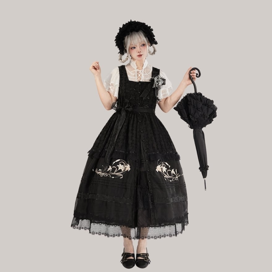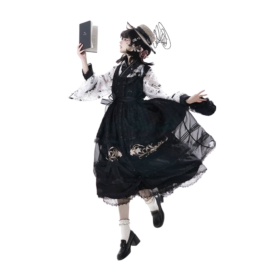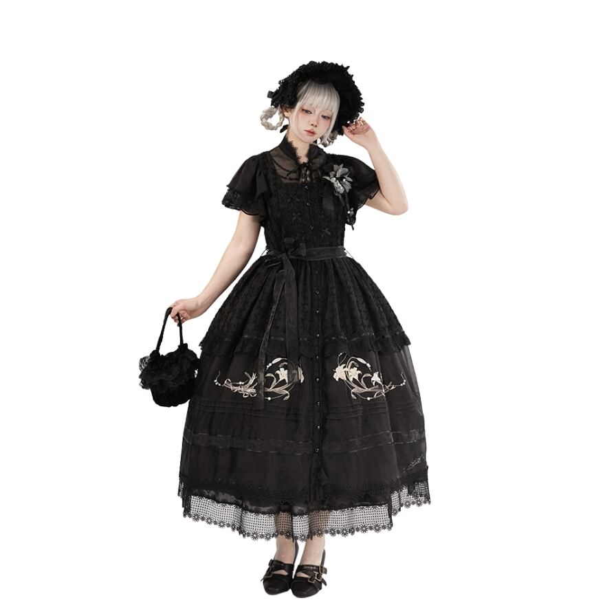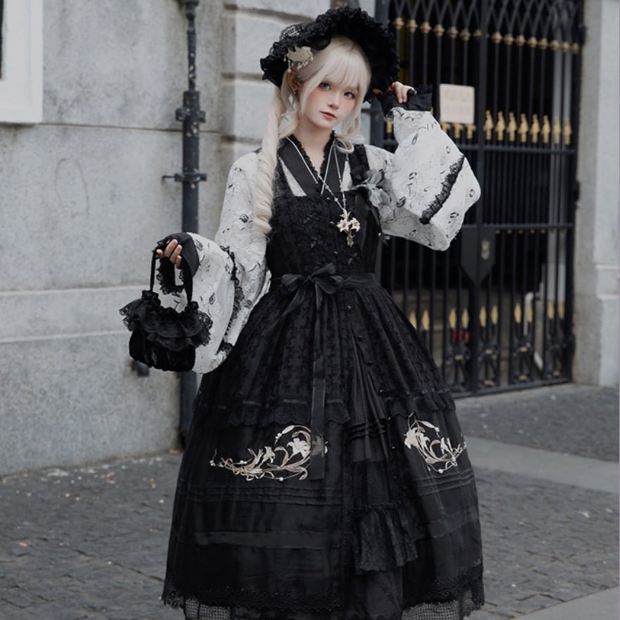 着物のように前で合わせるデザインが、東洋の美しさを演出。そこに、クラシカルなロリィタのフリルやレースが加わり、異文化が融合したような独特の世界観を生み出しています。
