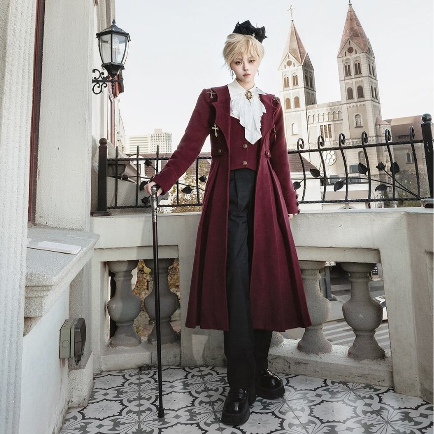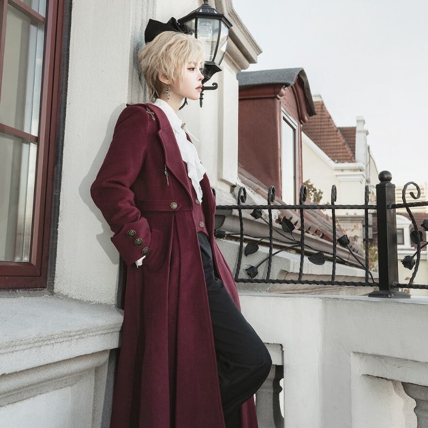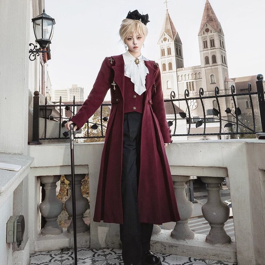 このコートは、皇子系ロリィタやゴシックファッションの要素を取り入れた、存在感のあるデザインが特徴です。