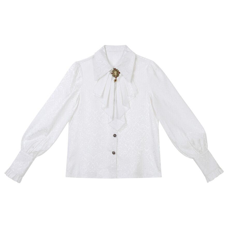 胸元には華やかなフリルがあしらわれ、クラシカルな雰囲気を醸し出します。