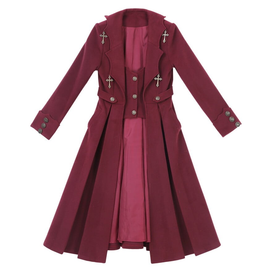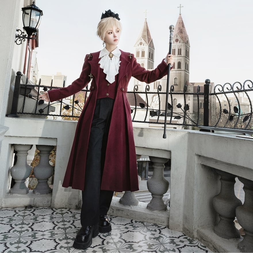 コート: ベルベットのような光沢のある生地を使用した、重厚感のあるコート。袖口のフリルと、金ボタンが、クラシカルで豪華な雰囲気を演出します。