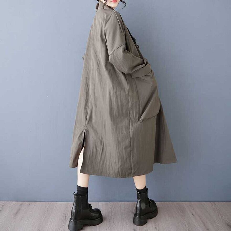 長めの着丈が、縦のラインを強調し、スタイルを良く見せる効果があります。ゆったりとしたシルエットは、インナーを選ばず、様々なレイヤードスタイルを楽しめます。