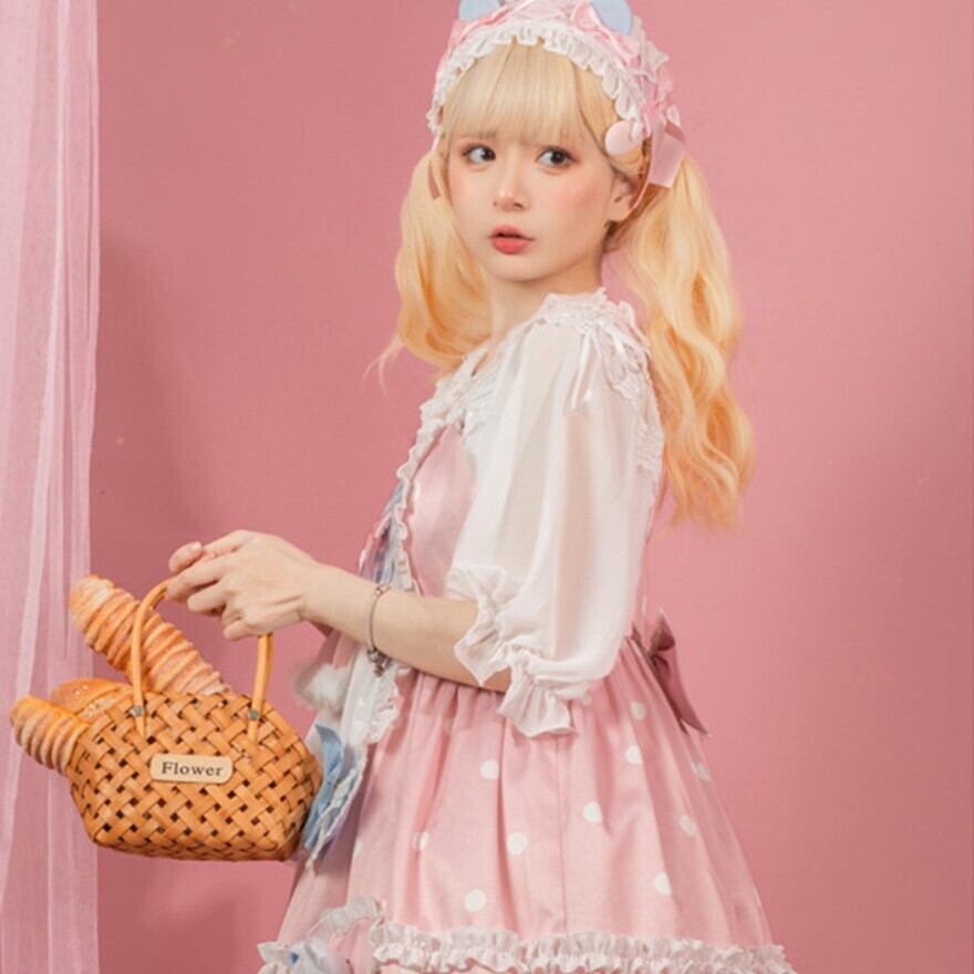 パステルピンクの生地に、白いドット柄が散りばめられた、可愛らしいジャンパースカートです。白いブラウスやレースの袖、フリルがふんだんにあしらわれており、胸元には水色のチェック柄とリボンがアクセントになっています。スカートの裾には、フリルや水色のライン、そしてクマのモチーフが飾られ、遊び心あふれるデザインです。