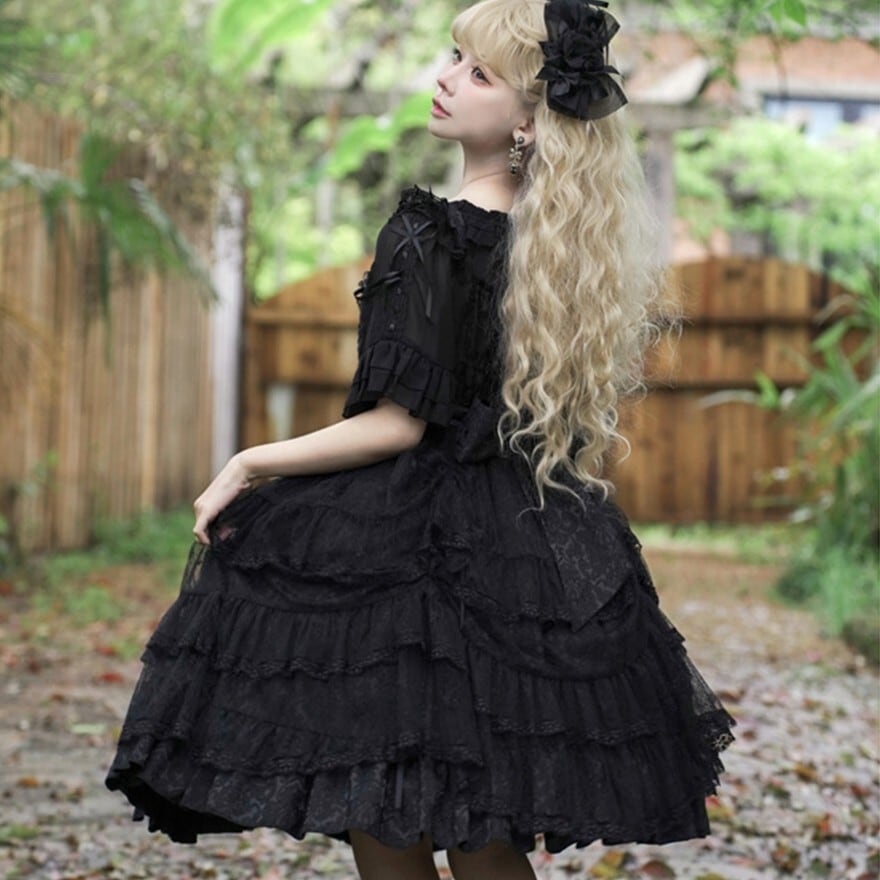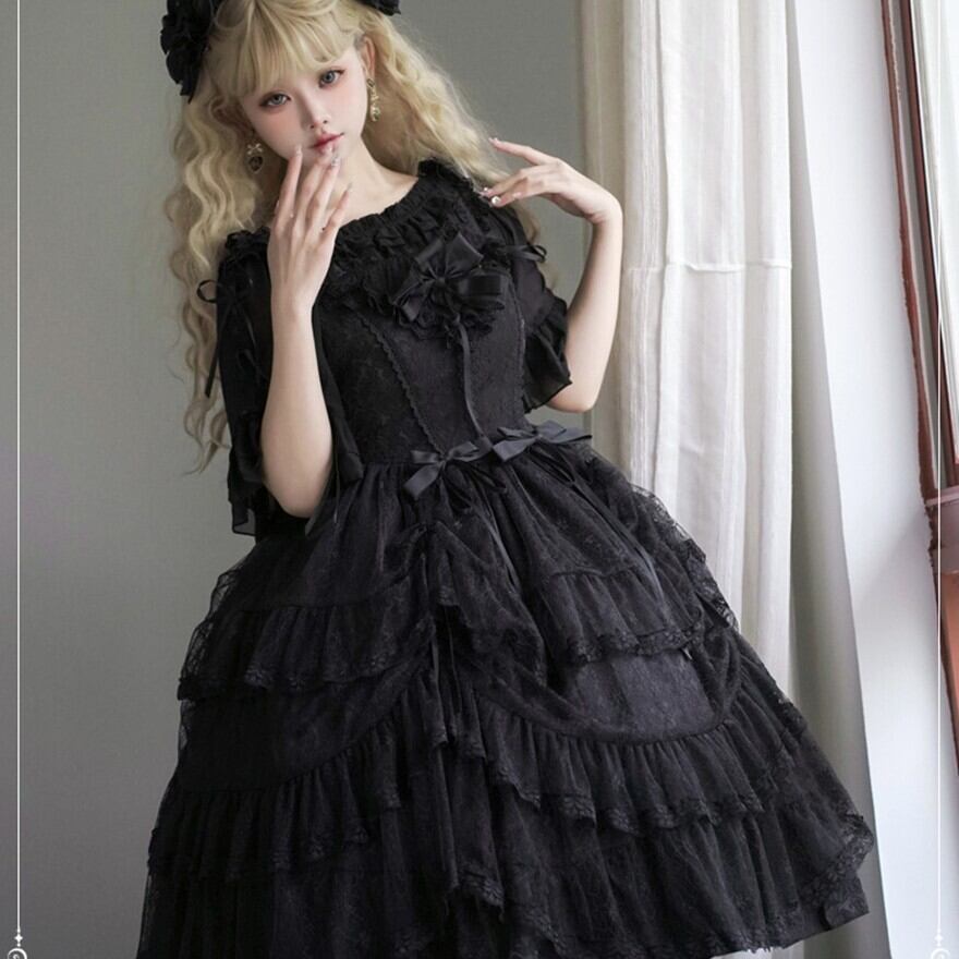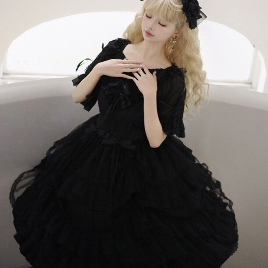 ブラックの生地に、同色の繊細なレースやフリルがふんだんにあしらわれた、クラシカルロリータのワンピースです。