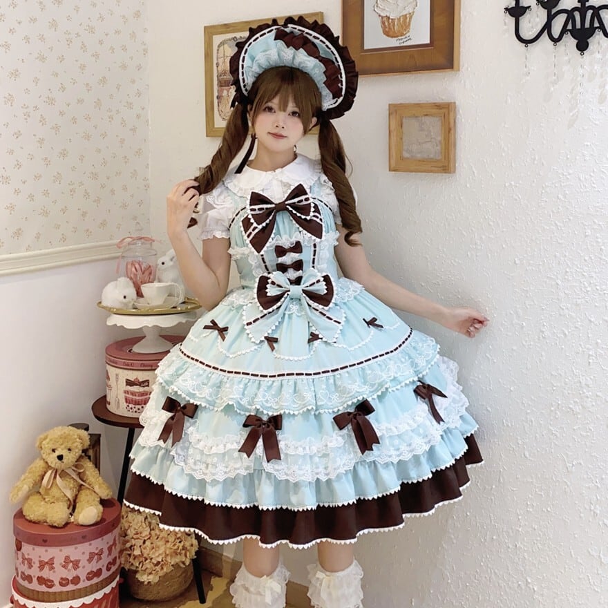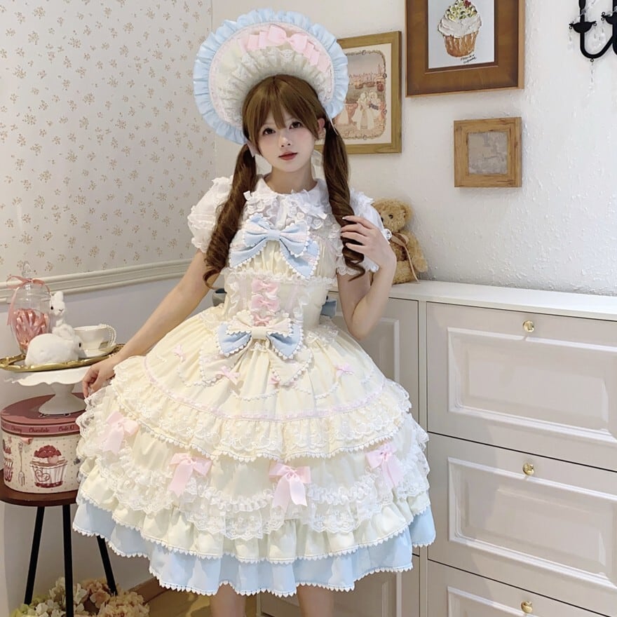 胸元は編み上げと複数のリボンで飾られ、スカート部分はティアードフリルが重なり、レースやスカラップカット、そして小さなリボンがふんだんにあしらわれています。