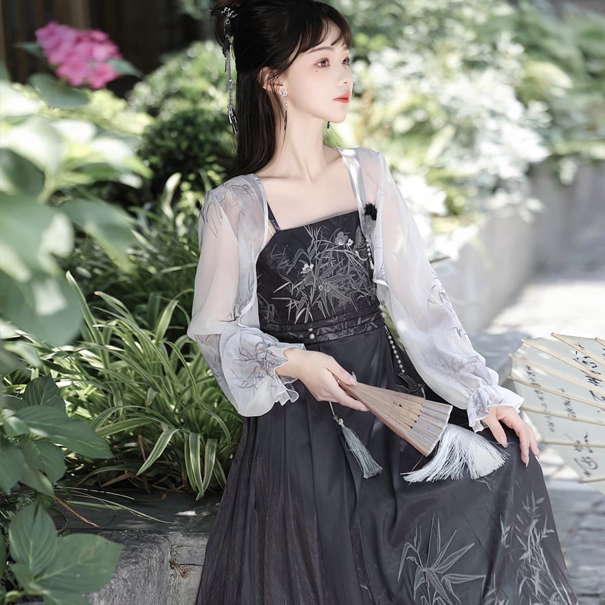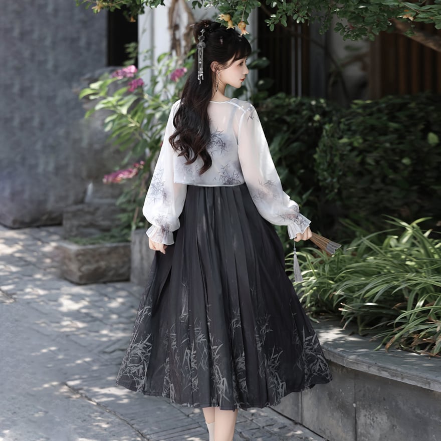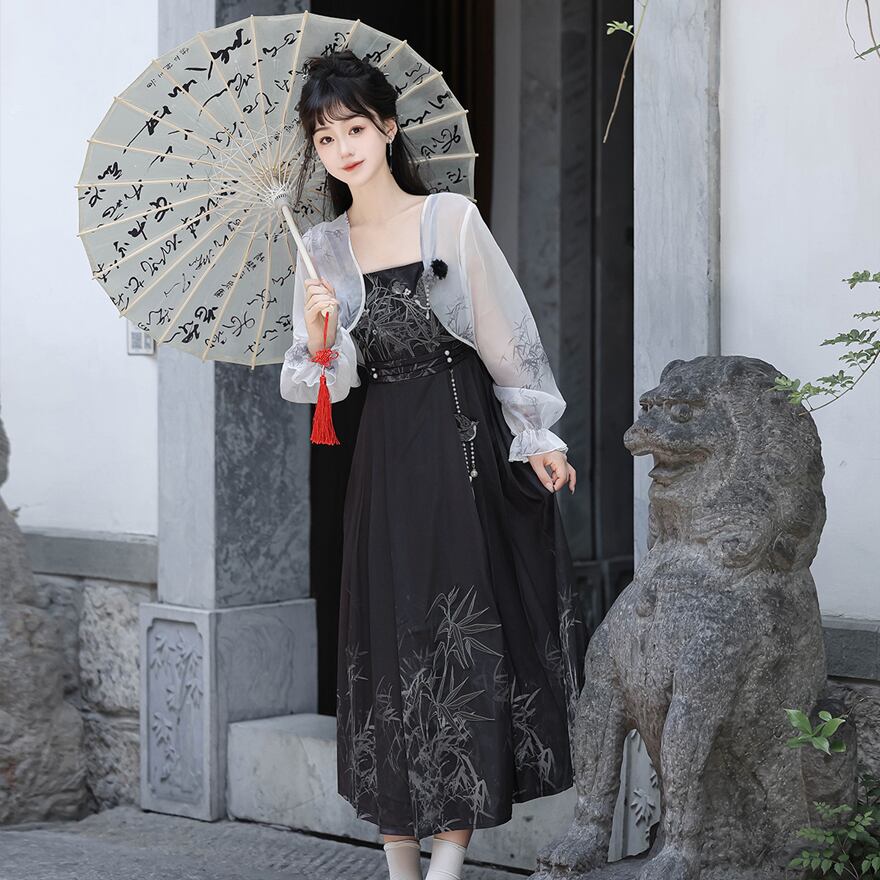 墨絵のような竹の模様が印象的な、黒地の吊りスカートと、透け感のある白いシアー素材のトップスがセットになった、優雅なセットアップです。