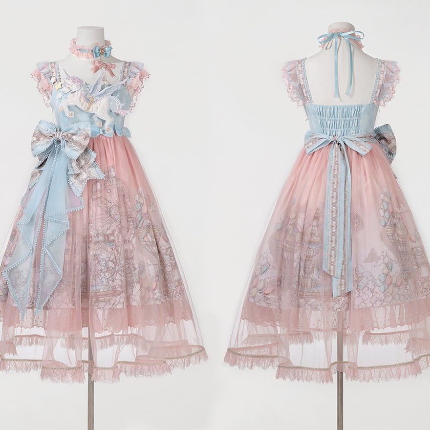 パステルブルーとピンクのグラデーションが美しい、ユニコーンモチーフのロリータドレスです。