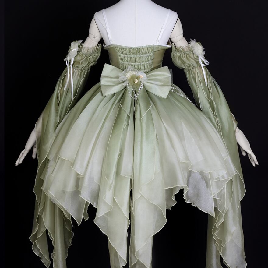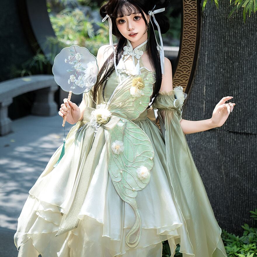 淡いグリーンとホワイトを基調とした、優雅な中華ロリータドレスです。胸元はオフショルダーのホルターネックデザインで、繊細なレースがあしらわれています。左サイドには立体的な蝶の羽のようなモチーフが施され、その周りには小花やビーズの装飾が散りばめられています。スカート部分は、グリーンからホワイトへのグラデーションがかった軽やかなシフォン生地が幾重にも重なり、花びらのように不規則な裾のラインが特徴的です。取り外し可能なアームカバーもセットになっており、より幻想的な雰囲気を高めます。