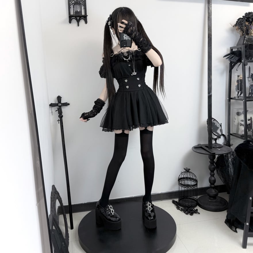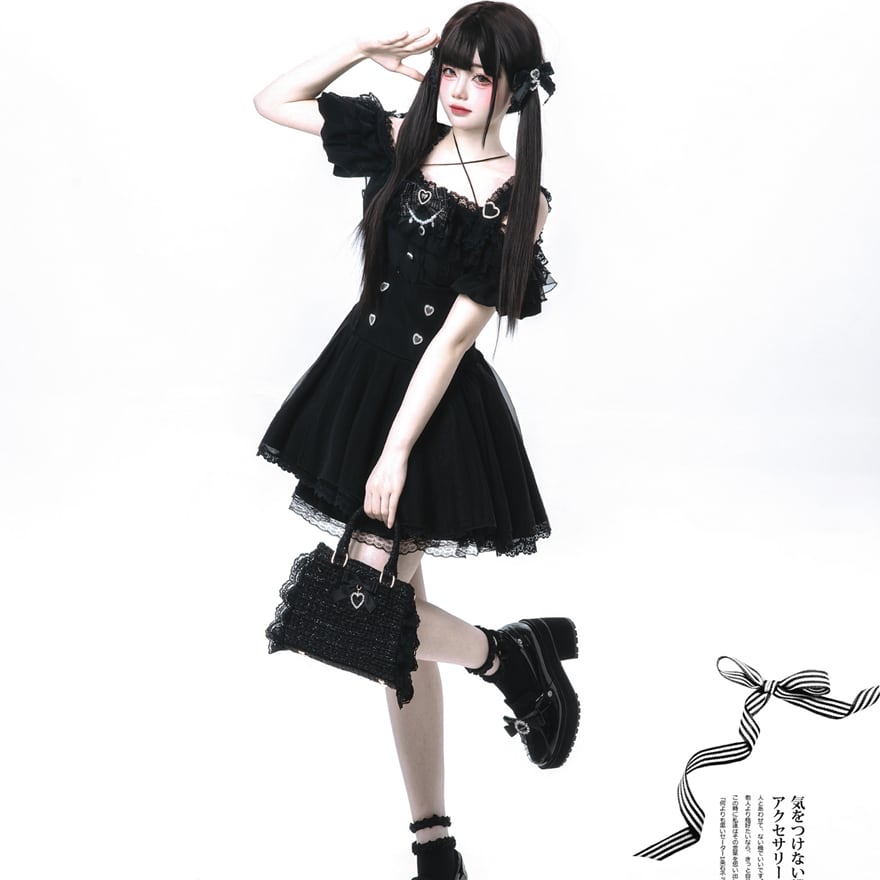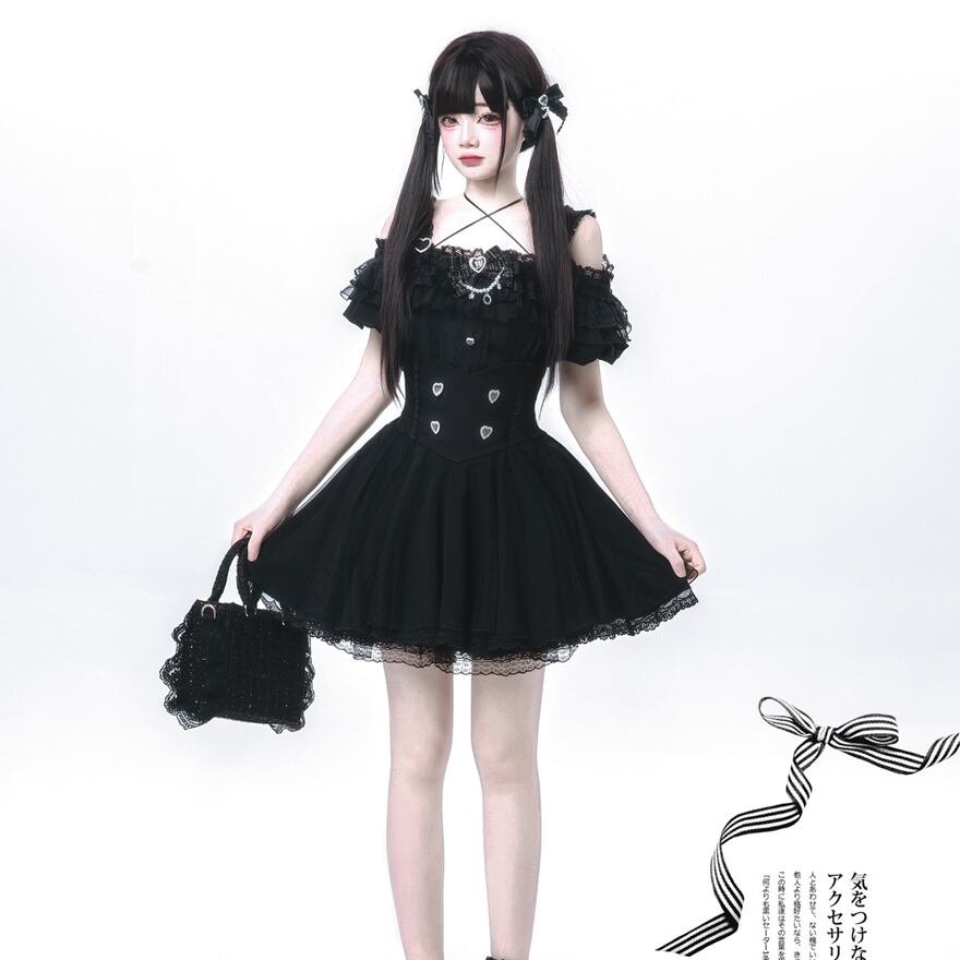 黒を基調とした、甘さとダークさが融合したゴシックロリータのセットアップです。トップスはオフショルダーデザインで、肩のストラップにはハート型の金具が、胸元にはレースと小さなハートの装飾、そして中央にはリボンとラインストーンがあしらわれています。袖はフリルが何段にも重なったパフスリーブで、可愛らしさをプラスしています。スカートはミニ丈のフレアシルエットで、ウエスト部分にはハート型のボタンが縦に配され、裾には繊細なレースが施されています。セットで着用することで、統一感のあるゴシックドーリースタイルが完成します。