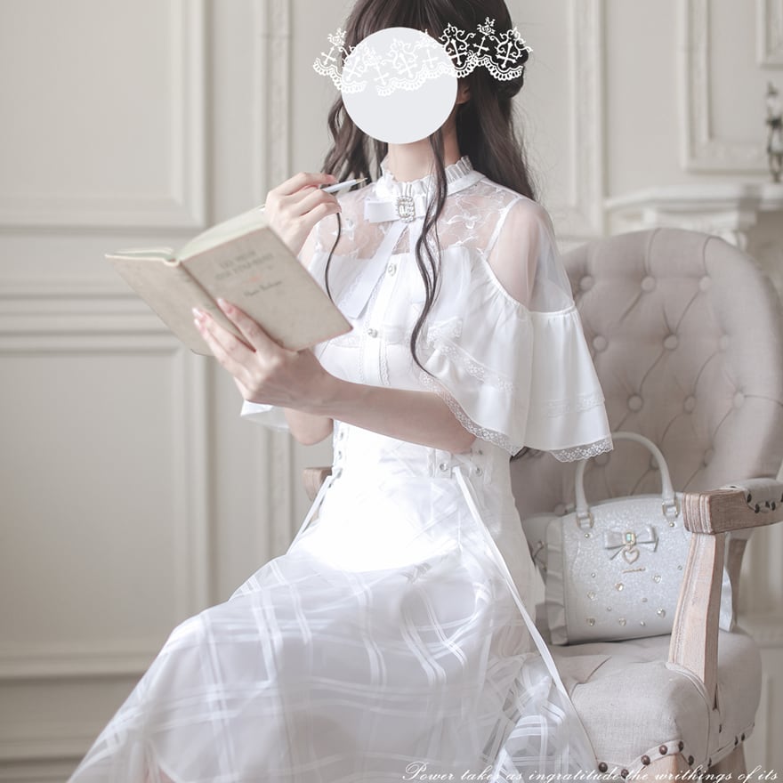 関連キーワード: #ロリータ #クラロリ #セットアップ #ホワイト #レース #シアー素材 #エレガント #清楚 #可愛い #オフショルダー #透け感スカート