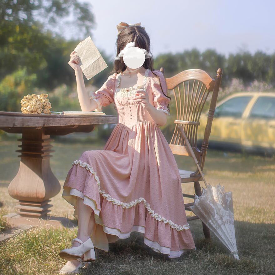 量産型 ロリータ ワンピース ピンク クラロリ フレンチガーリー 田園風 控えめ 胡桃木