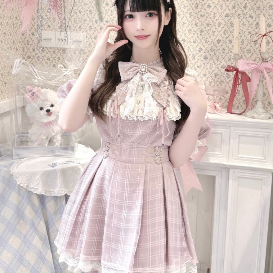 パステルピンクのチェック柄生地に、オフホワイトの繊細なレースが襟元、肩、袖、裾にあしらわれた、クラシカルロリータのワンピースです。