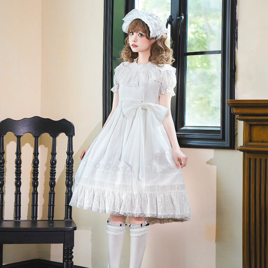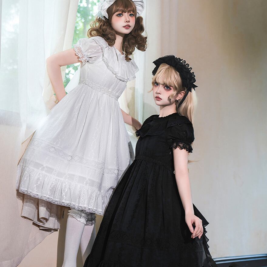 ブラックとホワイトの2色展開で、どちらも繊細なレースが襟元、袖、裾にあしらわれた、クラシカルロリータのワンピースです。