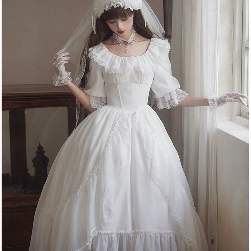 純白の生地をベースに、オフショルダーの襟元と、幾重にも重なるフリルやレースが特徴のロリィタドレスです。