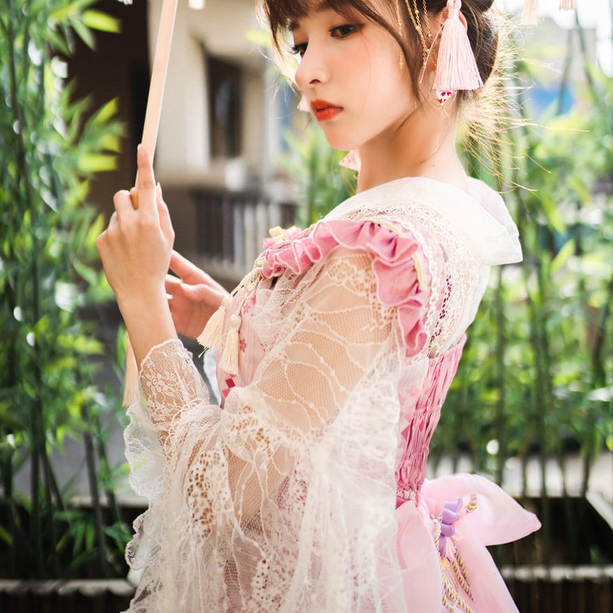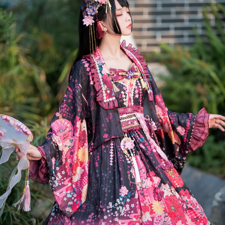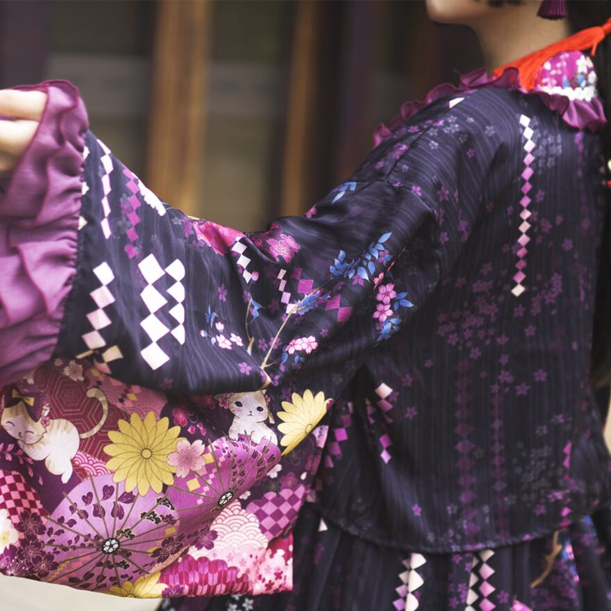 日本の伝統的な振袖の要素を取り入れた、華やかなロリータファッションの羽織りです。
