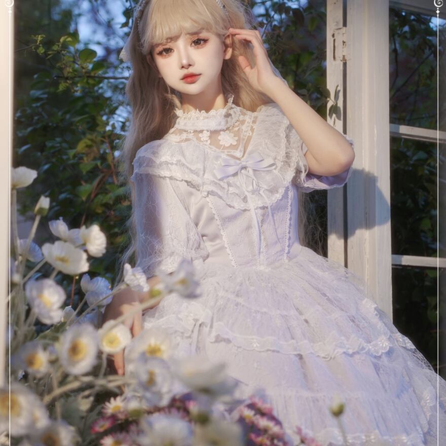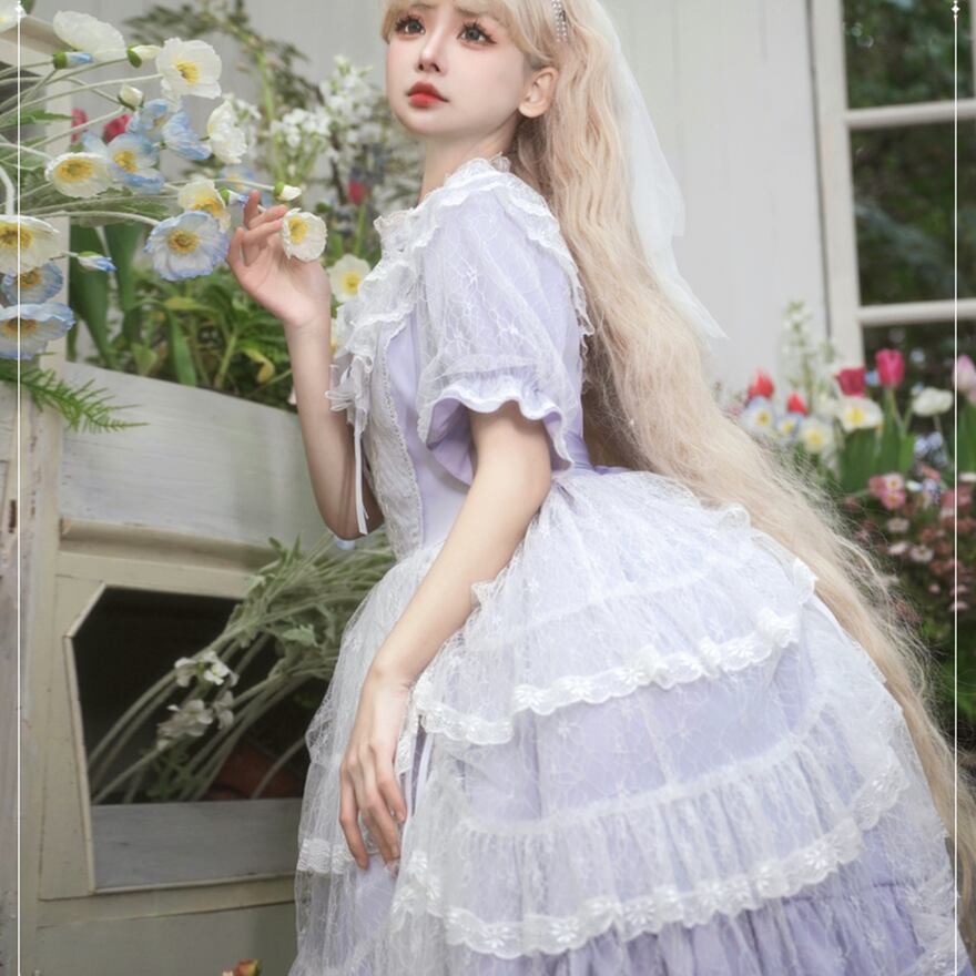 淡いラベンダー色の生地に、オフホワイトの軽やかなレースが幾重にも重ねられた、ロマンティックなロリータドレスです。