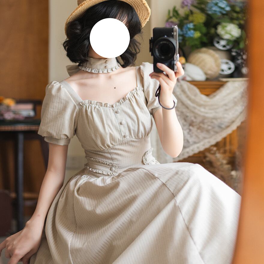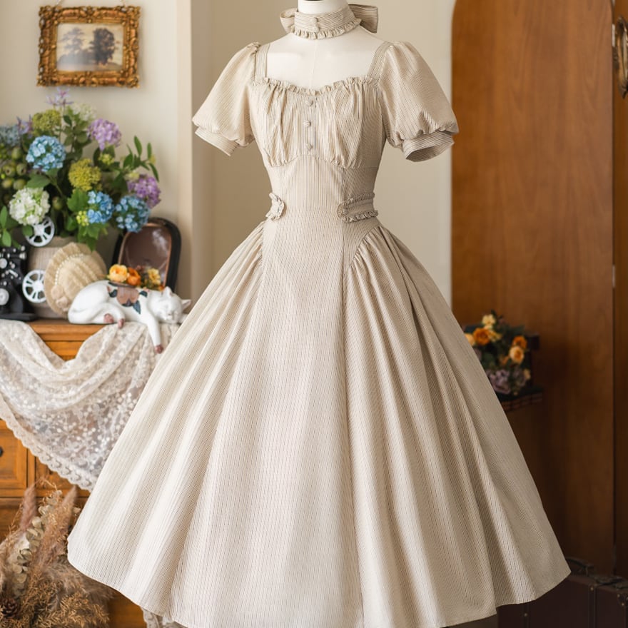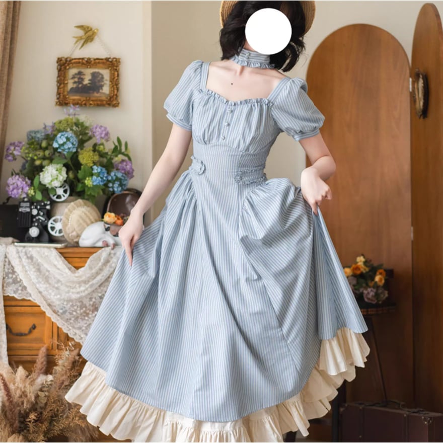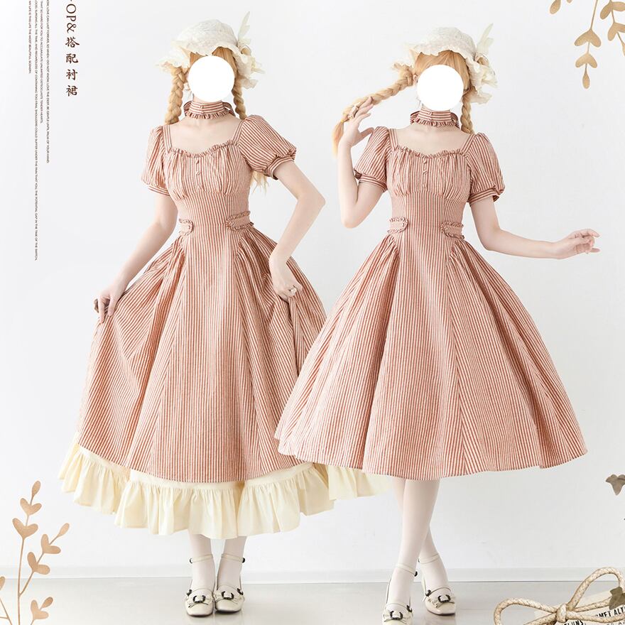 淡いピンク、ベージュ、水色の生地に、控えめなストライプ柄があしらわれた、クラシカルロリータのワンピースです。スクエアネックとパフスリーブが可愛らしい印象を与えます。