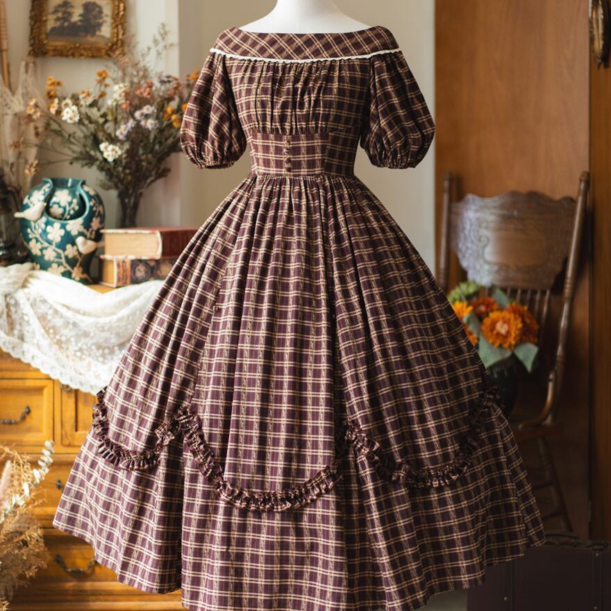 落ち着いたブラウン系とグレー系のチェック柄生地に、オフショルダーとパフスリーブが特徴的なクラシカルロリータのワンピースです。オフホワイトのティアードスカートが裾から覗き、可愛らしさを添えています。