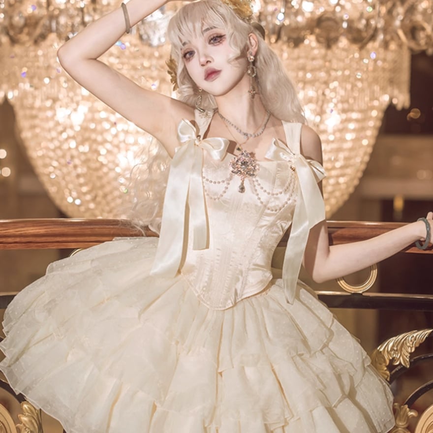 アイボリーのサテン生地で作られたコルセット風のサスペンダーブラと、幾重にも重なるフリルが特徴のミニスカートのセットです。