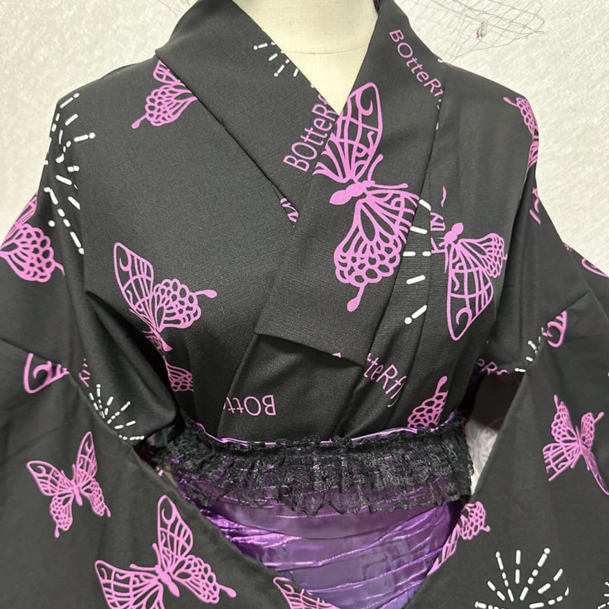 ダークなモチーフとレースの組み合わせが、クールでありながらも愛らしい印象を与える浴衣です。一般的な浴衣では物足りない、周りと差をつけたい方におすすめです。