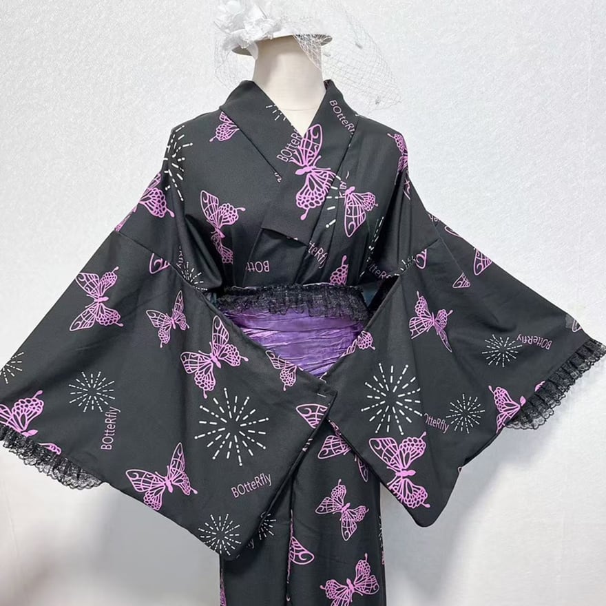 もう一色の浴衣は、黒地にピンクの蝶と花火のような模様が散りばめられ、可愛らしさと華やかさを演出しています。