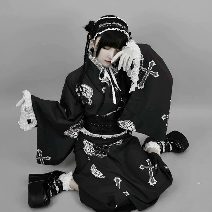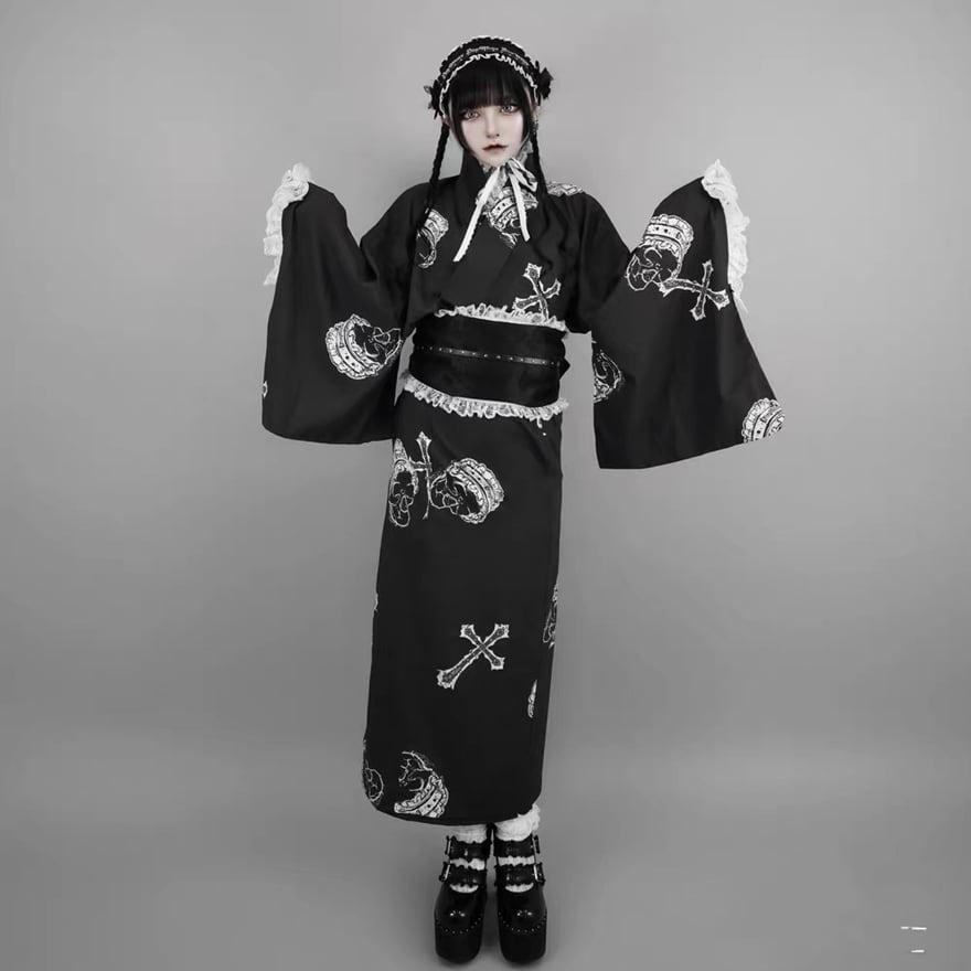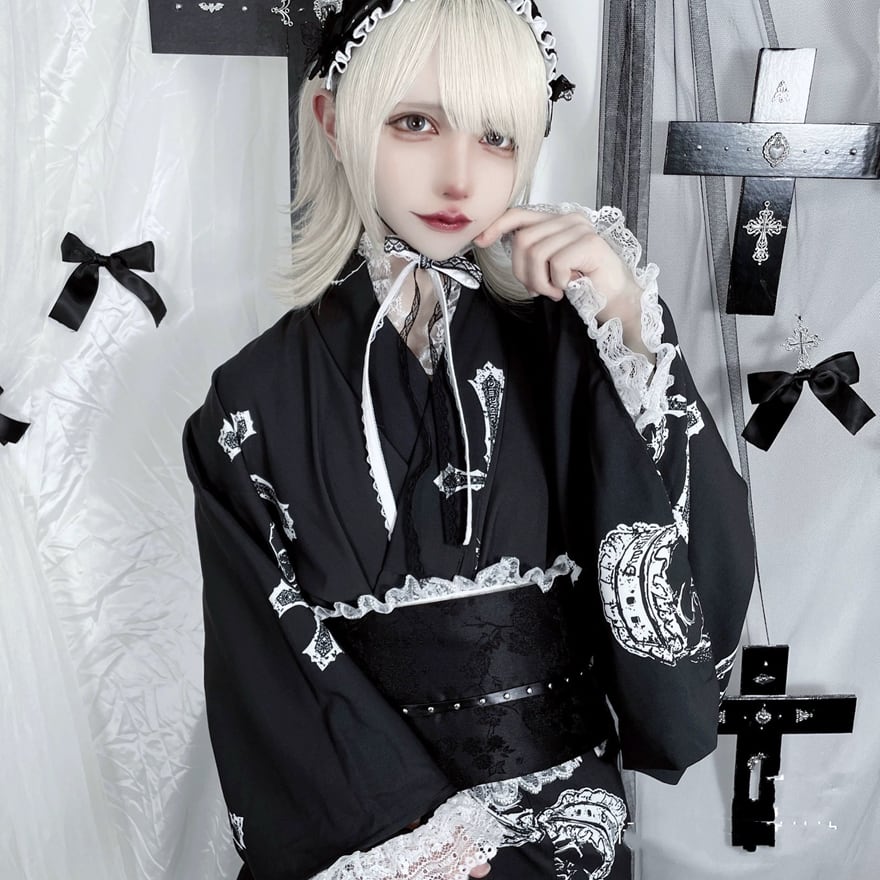ブラックの生地に、十字架や王冠、骨などのゴシックなモチーフが大胆にあしらわれた、個性的な浴衣です。袖口や襟元にはオフホワイトのフリルレースが施され、甘さとダークさを両立させたデザインとなっています。