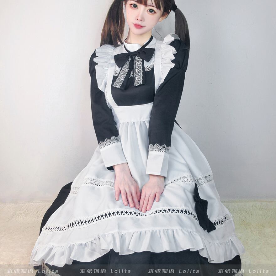 ブラックの長袖ワンピースに、ホワイトのエプロンとフリルが重ねられた、メイド服風のクラシカルロリータのワンピースです。