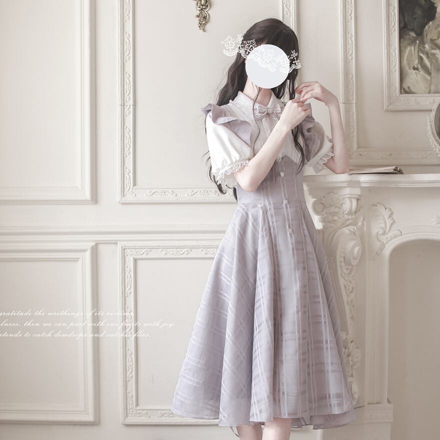淡いラベンダーグレーのチェック柄生地に、肩のフリルとフロントのボタンがアクセントになった、クラシカルロリータのジャンパースカートです。