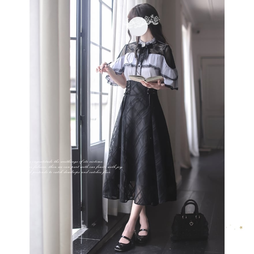 ブラウスは、デコルテ部分にブラックのレース、袖は透け感のあるシースルー素材とフリルデザインで、エレガントさと可愛らしさを兼ね備えています。
