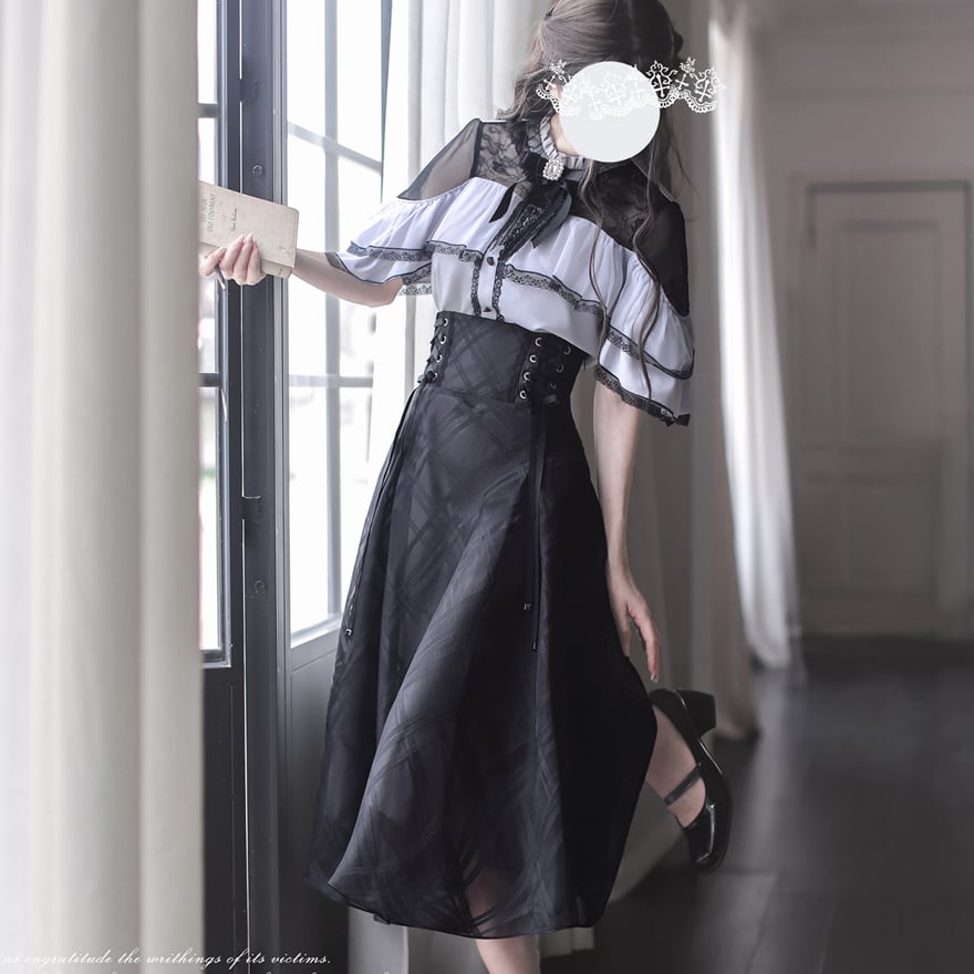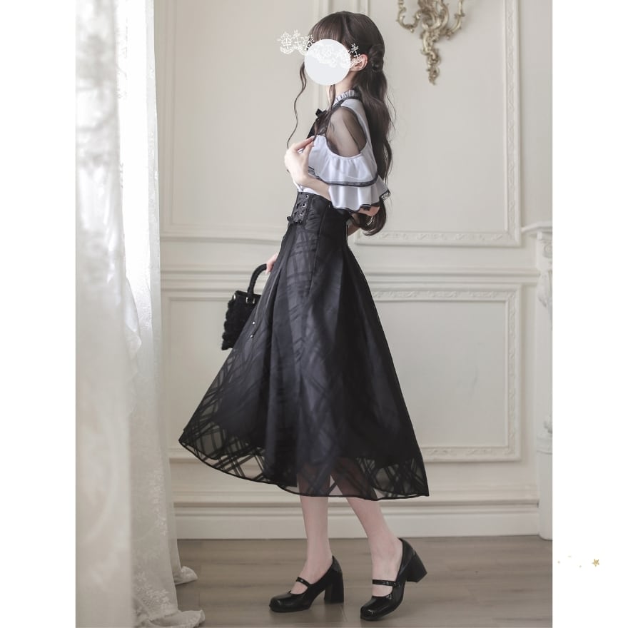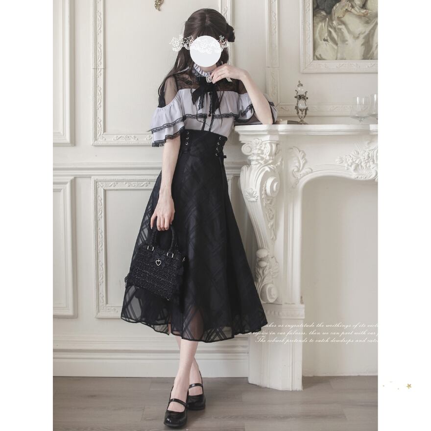 スカートは、シースルー素材のチェック柄で、ウエストのレースアップが特徴的です。
