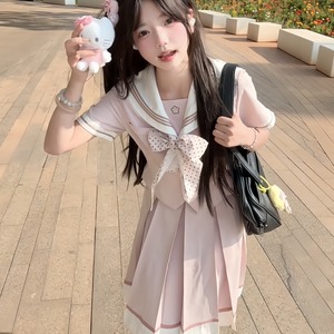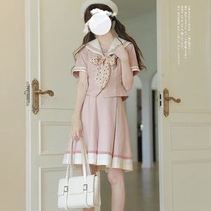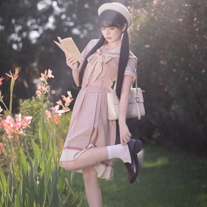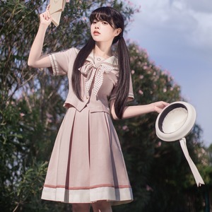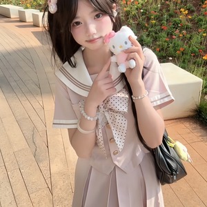 くすみピンクの生地に、白のセーラー襟とライン、そしてドット柄のリボンが特徴的なセーラー服のセットアップです。