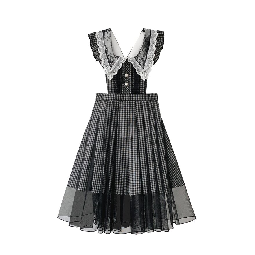 サスペンダースカートは、ギンガムチェック柄に、裾には透け感のあるブラックのチュールが重ねられており、軽やかな印象を与えます。