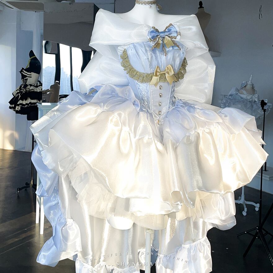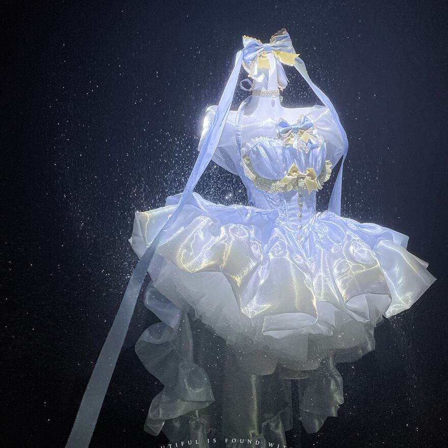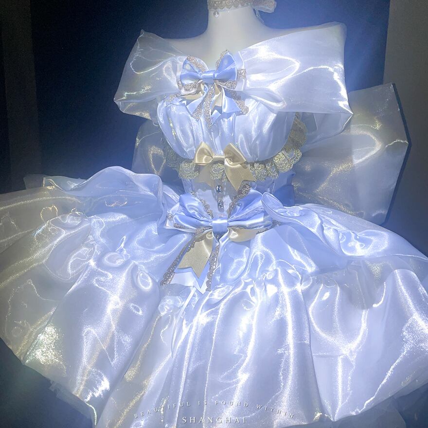 光沢のあるホワイトの生地に、爽やかなスカイブルーのリボンやフリルが随所に配されたロリータドレスです。