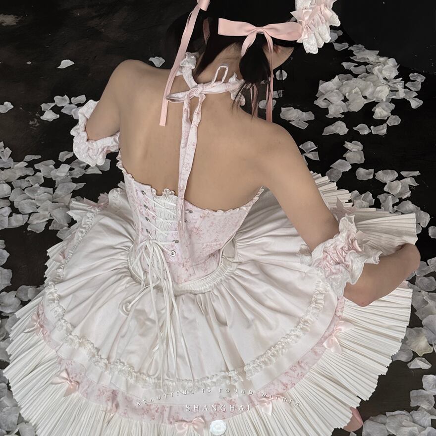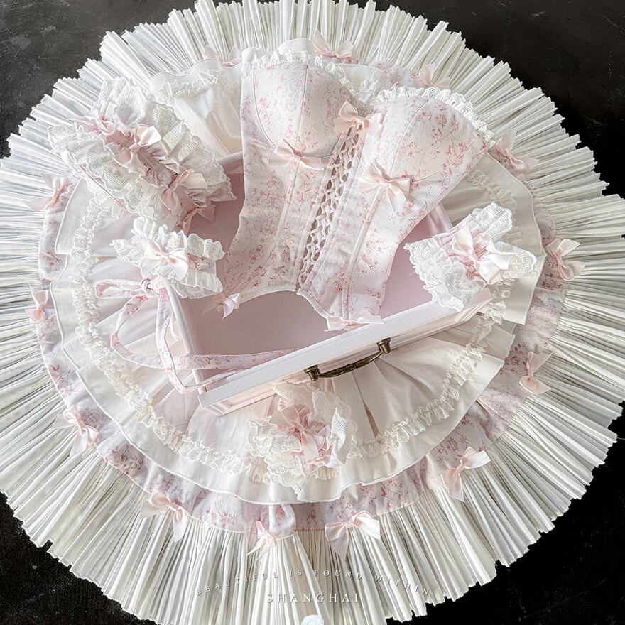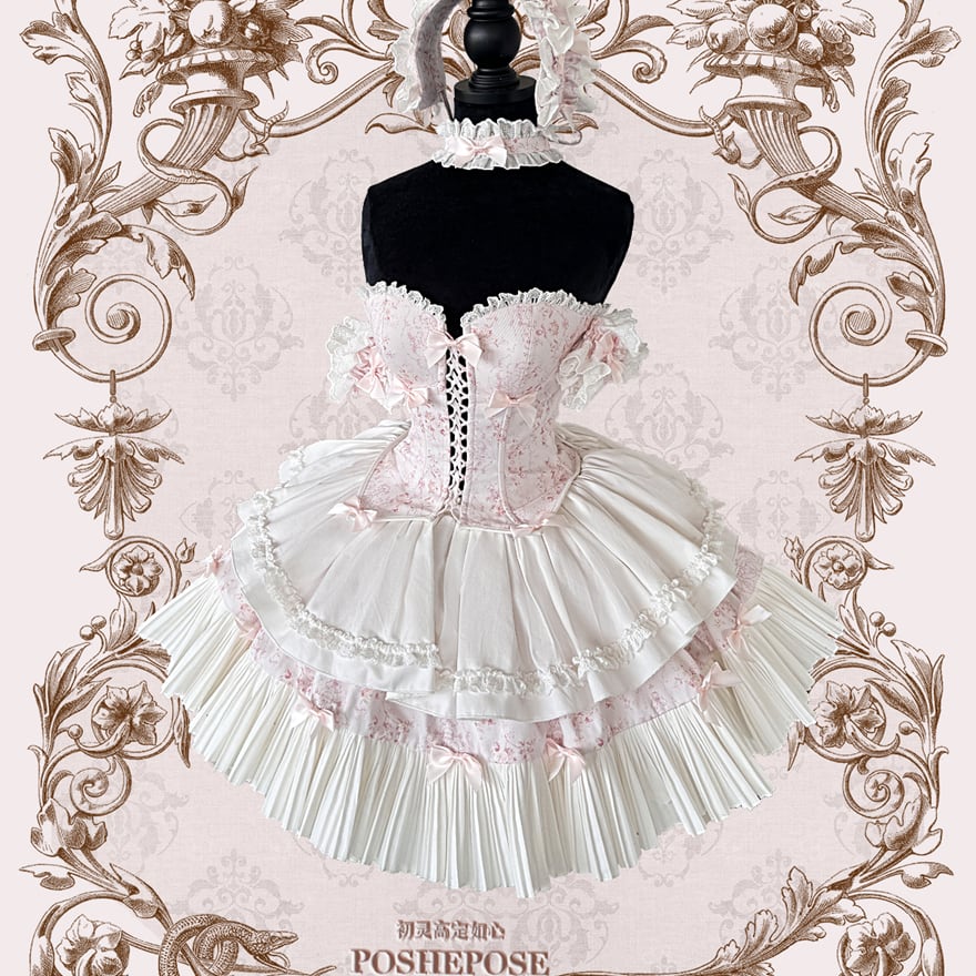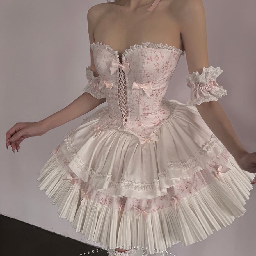 淡いピンクの小花柄のコルセットトップスに、ホワイトのプリーツスカートが組み合わされたロリータドレスです。