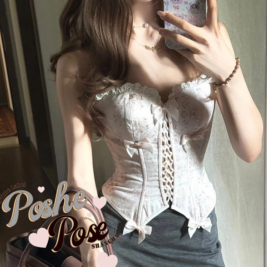 コルセットのフロントには編み上げとリボンがあしらわれ、スカートはプリーツとフリル、そして可愛らしいリボンが何層にも重なり、ふんわりと広がっています。