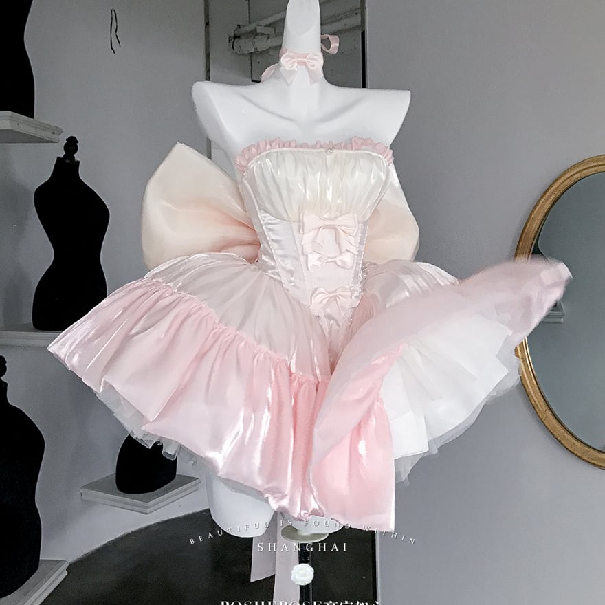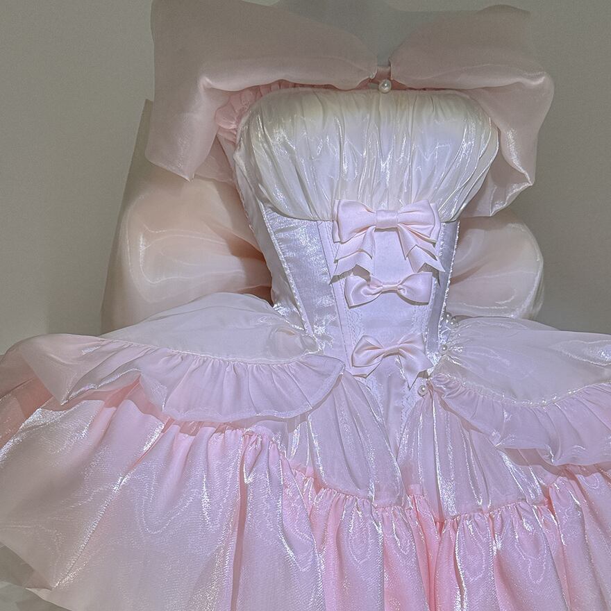 ウエスト部分にはホワイトのコルセットデザインが施され、可愛らしいリボンがアクセントになっています。肩には大きなリボンが配され、後ろにも大きなリボンがあしらわれていることで、どこから見ても華やかな印象を与えます。