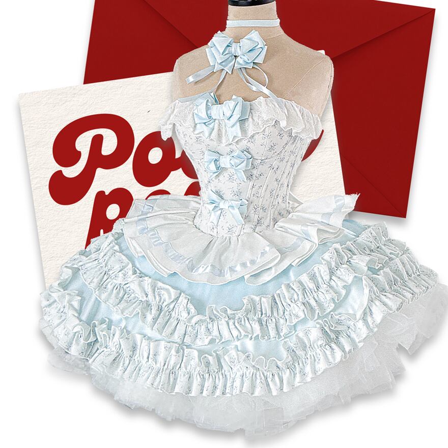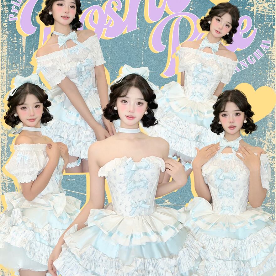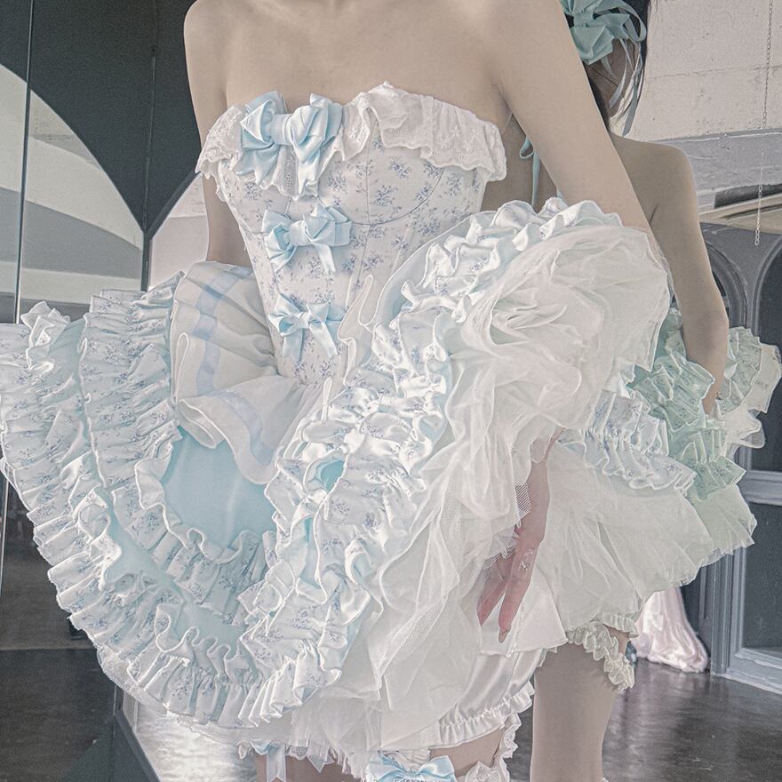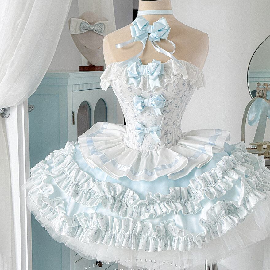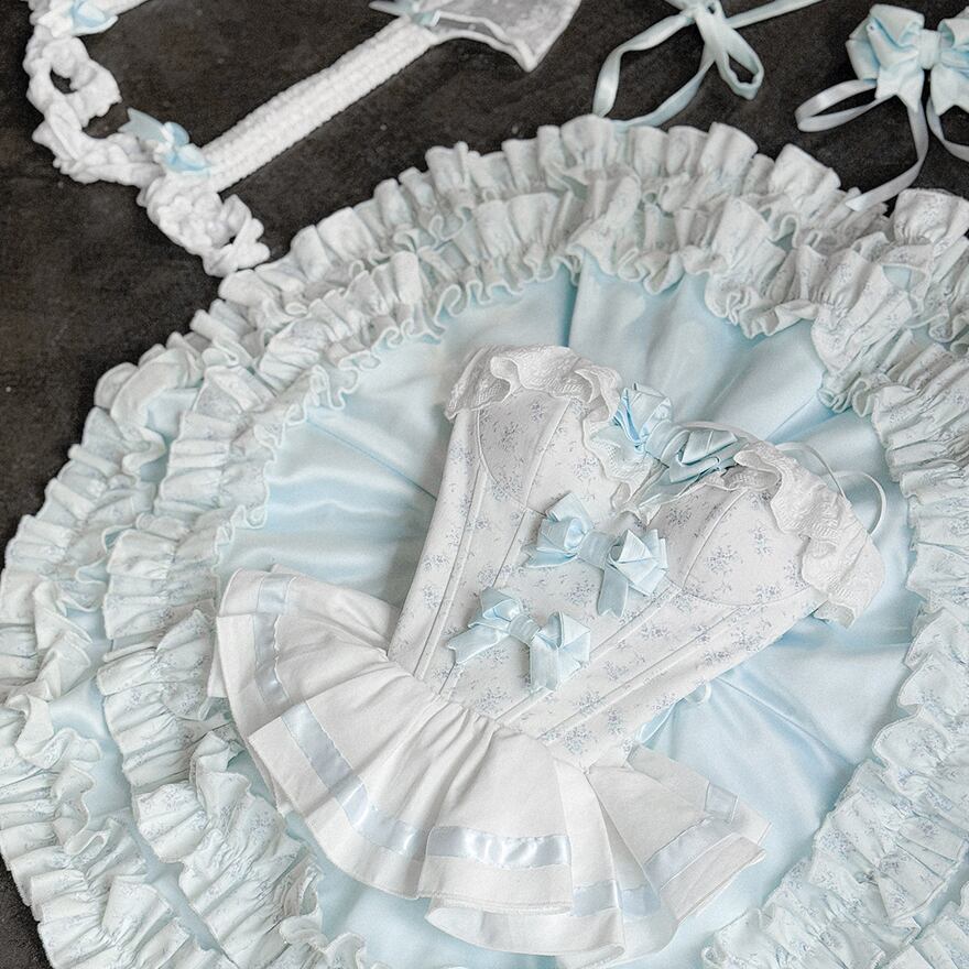 ビスチェ風のトップスには、水色のリボンと繊細なレースが縦にあしらわれ、胸元や肩にはフリルが施されています。スカートは幾重にも重なる水色と白のフリルが特徴で、ふんわりとしたボリューム感があり、ドーリーなシルエットを演出します。