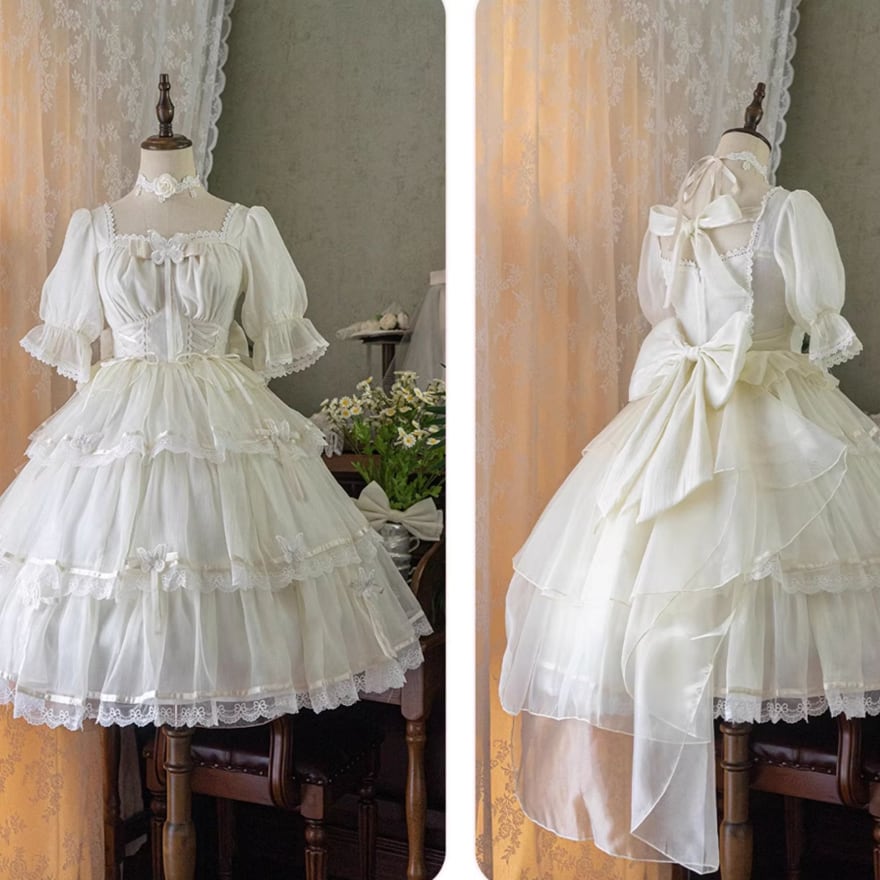 ブラックとホワイトの2色展開で、どちらも繊細なレースが襟元、袖、裾にあしらわれた、クラシカルロリータのワンピースです。