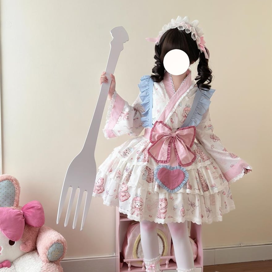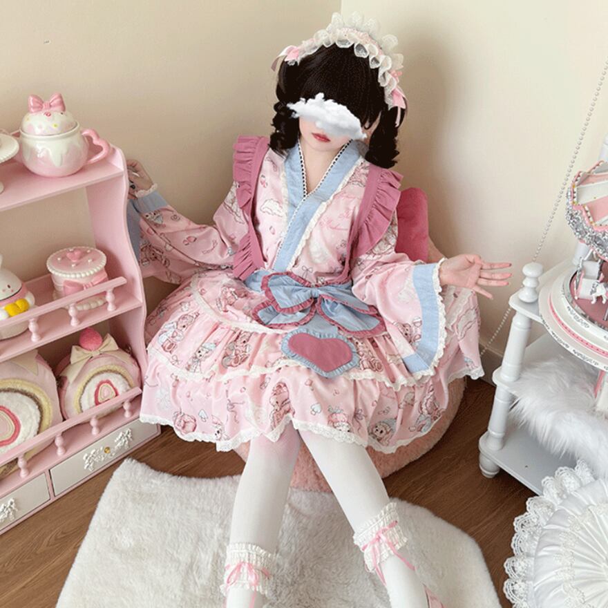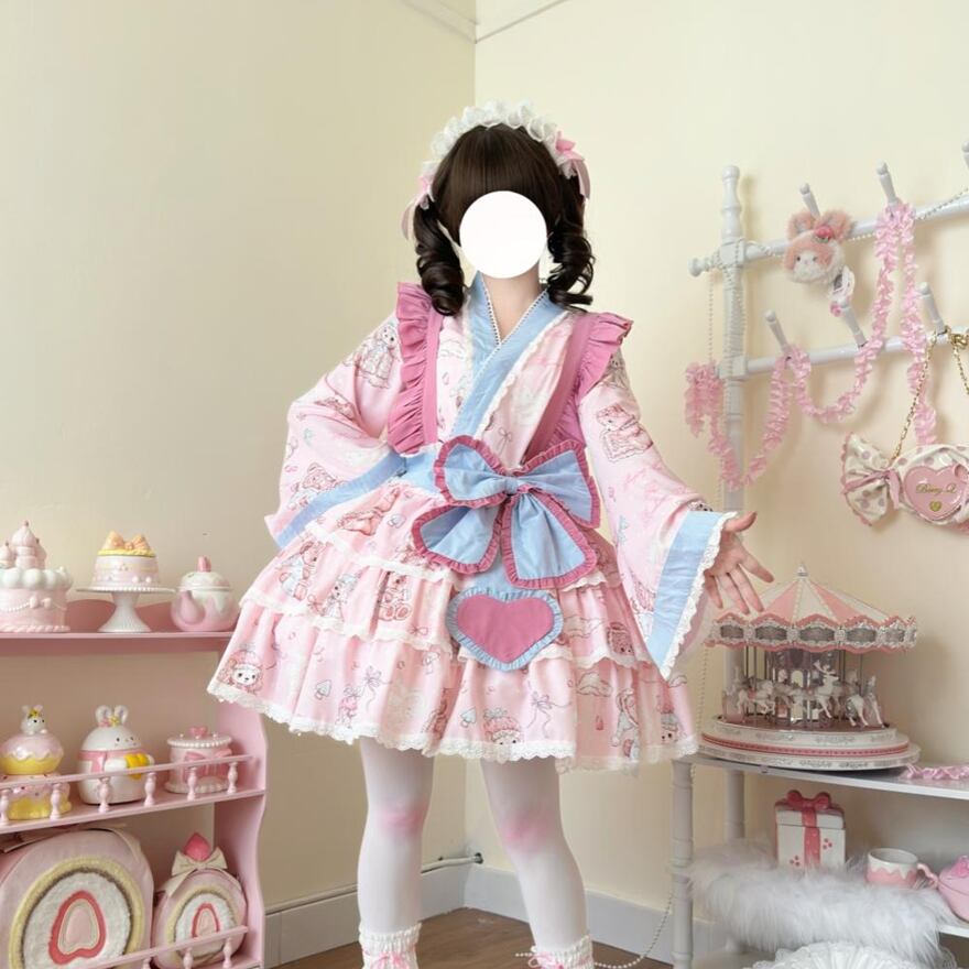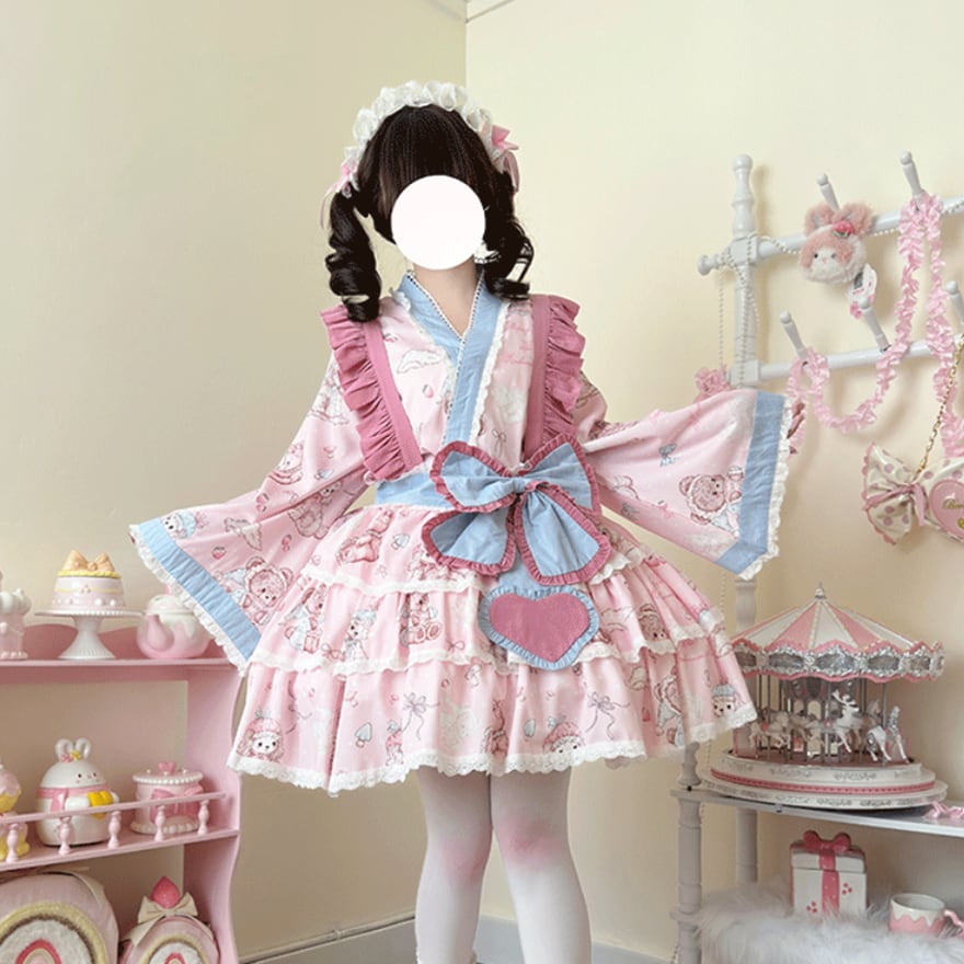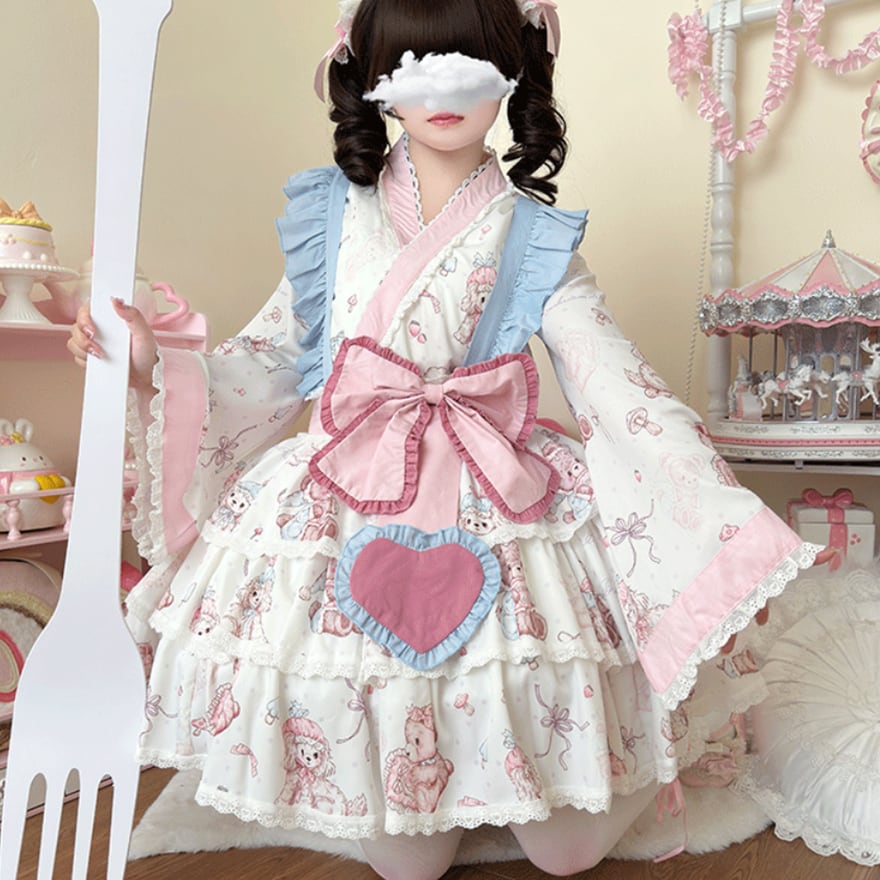 着物のような襟元と、ふんわりとした袖、そして胸元の大きなリボンとハートのモチーフが特徴的。
