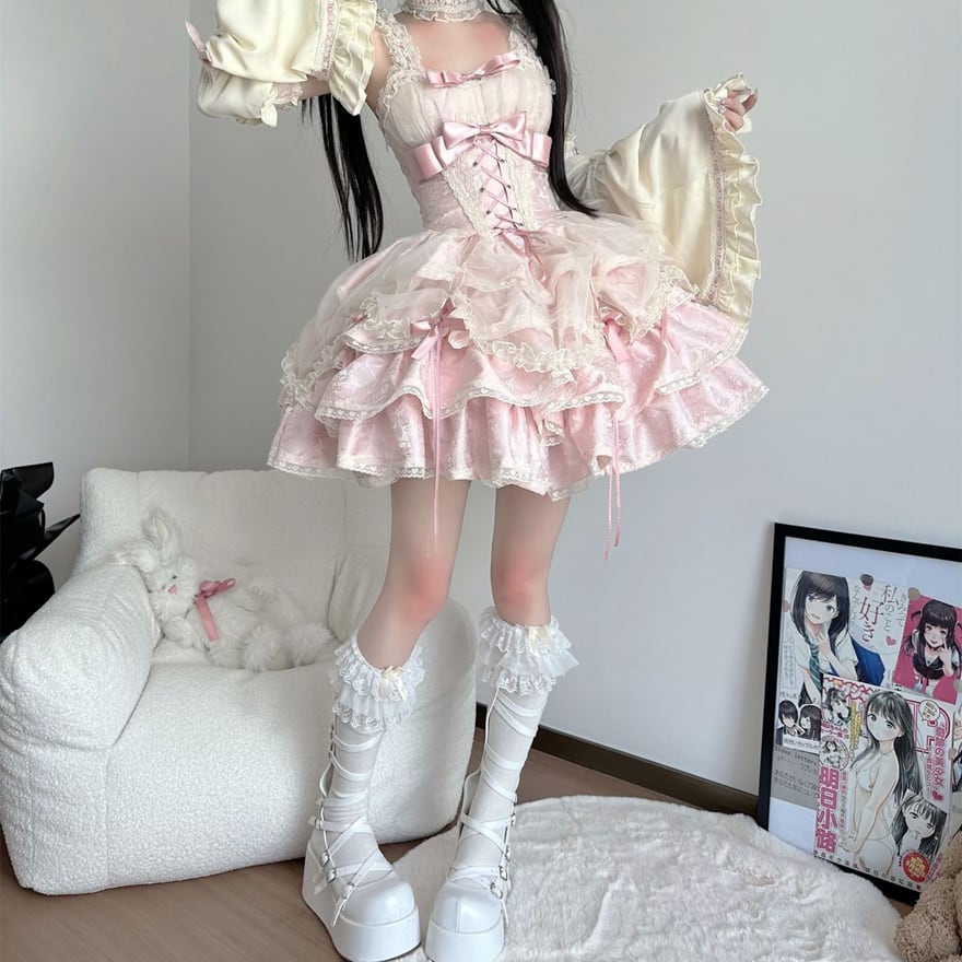 ビスチェ風の胸元デザインと編み上げのウエスト部分が、ウエストラインを美しく見せ、ふんわりと広がるティアードスカートがドーリーな印象を与えます。
