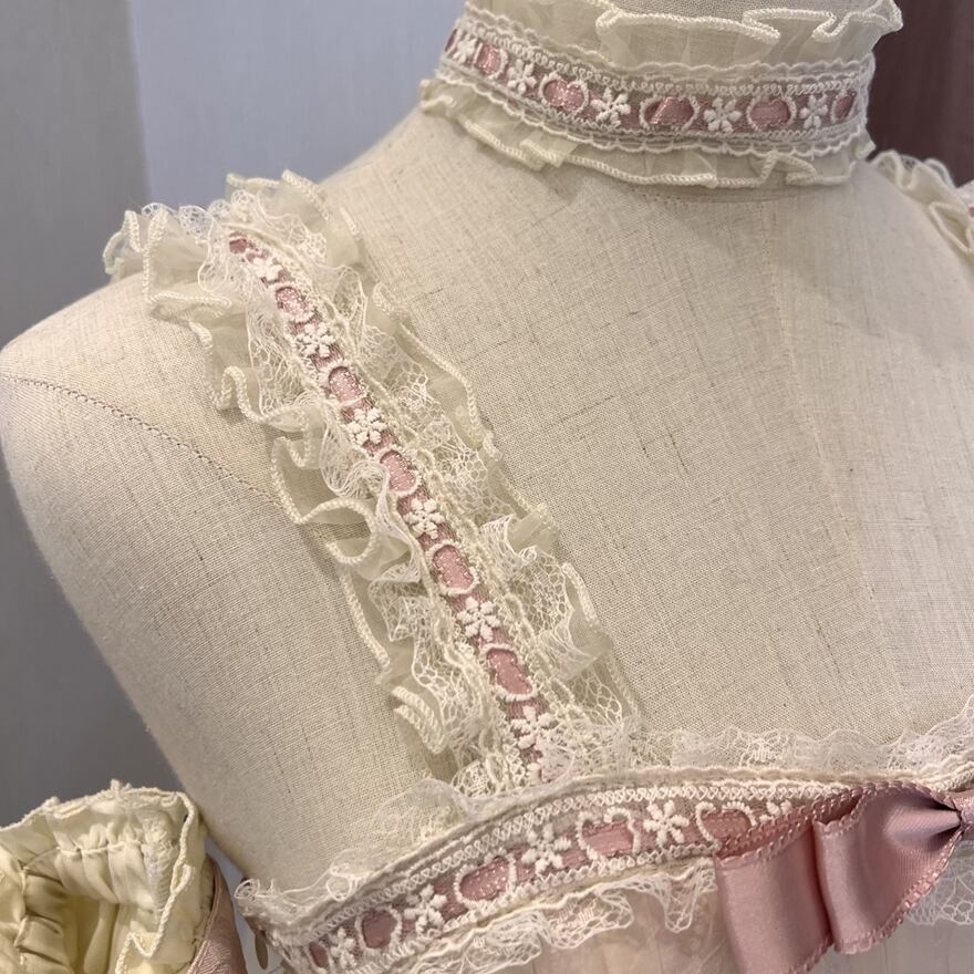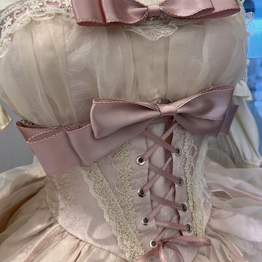 淡いピンクを基調とし、ホワイトの繊細なレースやリボンがふんだんにあしらわれた、ロマンティックなジャンパースカートです。