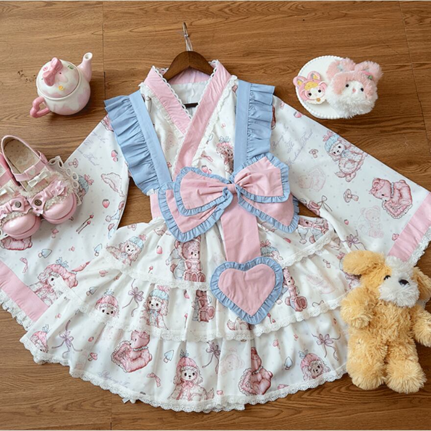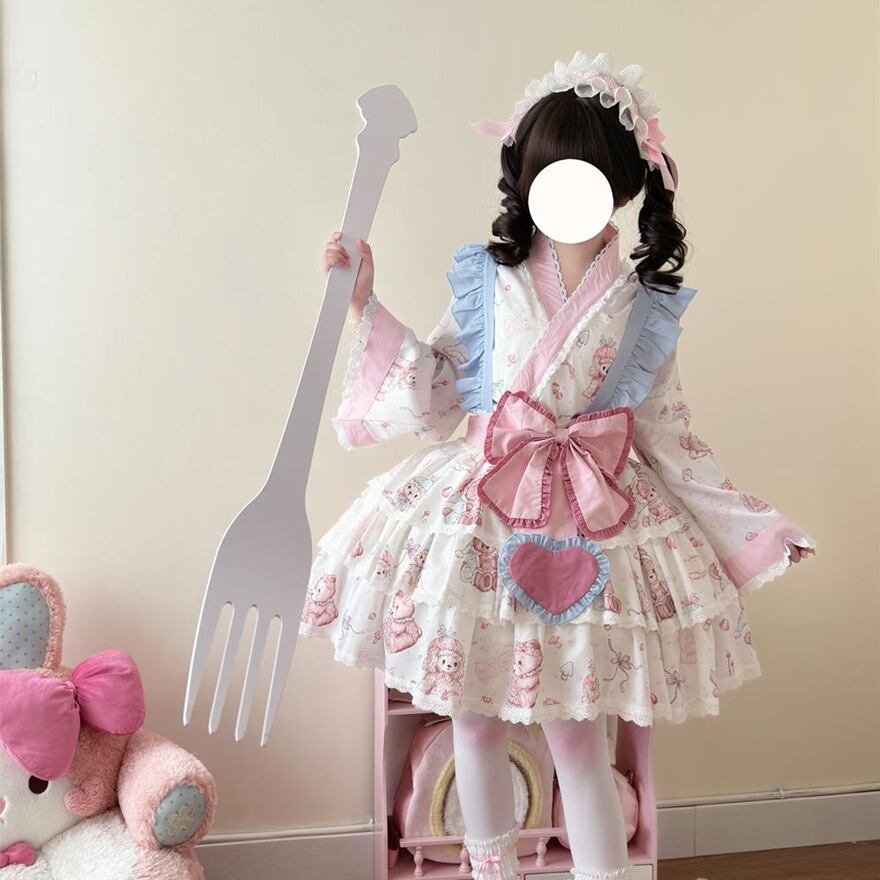 パステルカラーの生地に、愛らしいテディベアやスイーツの柄が散りばめられた和風ロリータスカートです。
