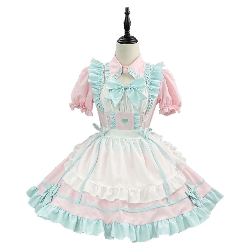 パステルカラーの組み合わせが目を引く、可愛らしいロリータメイド風セットアップです。カラーは、ピンクとミントグリーン、または水色とピンクの2種類。