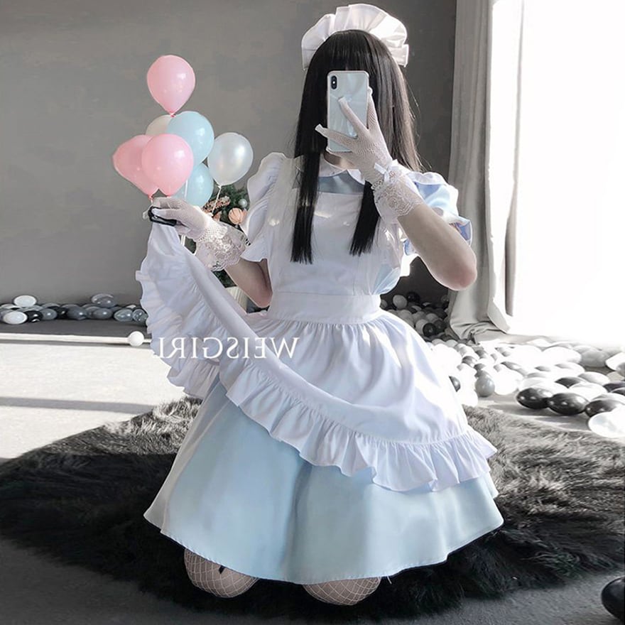 ワンピースは、パフスリーブの袖と首元にあしらわれたフリルが特徴的。エプロンは、裾にたっぷりのフリルが施され、動きに合わせてふわりと揺れる軽やかな印象を与えます。カチューシャもフリルとレースで飾られ、全体をより一層ドーリーな雰囲気に仕上げています。