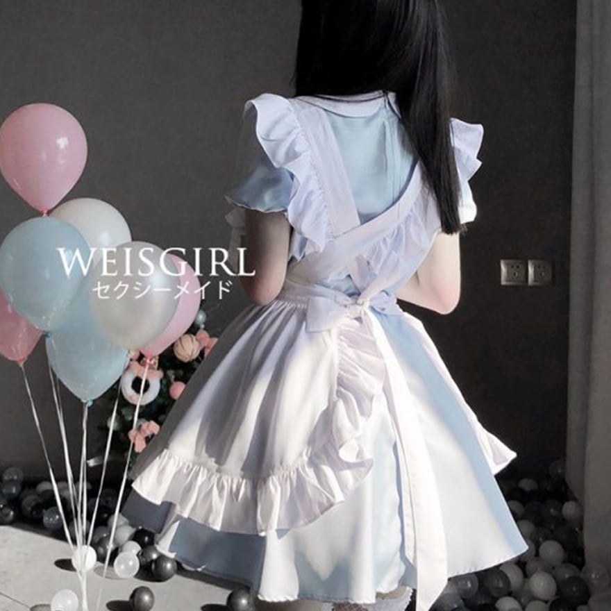 淡い水色のワンピースに、ホワイトのエプロン、カチューシャがセットになったメイド風の可愛らしいセットアップです。