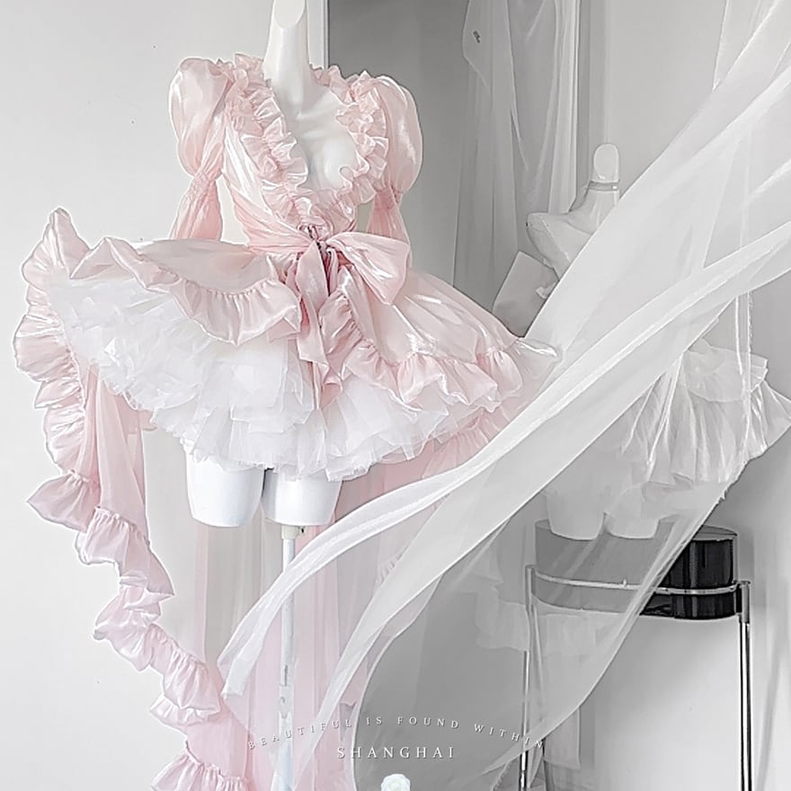 淡いベビーピンクの生地を基調に、オフホワイトのフリルとレースが贅沢にあしらわれた、アシンメトリーなロリータドレスです。