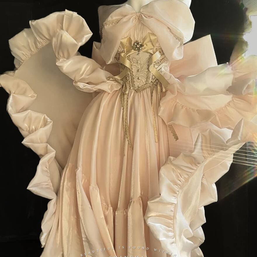 繊細なフリルと、輝くゴールドが織りなす、ため息が出るほど美しいドレス。