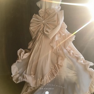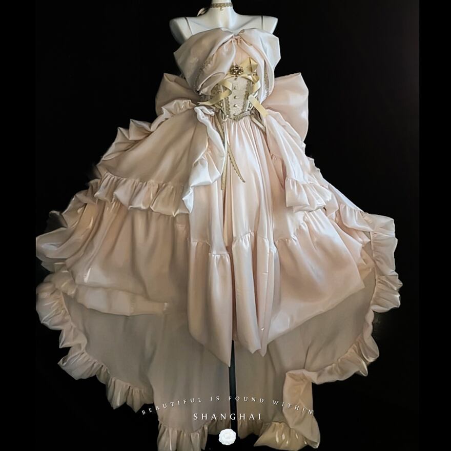 スカートは幾重にも重なるフリルと、流れるようなドレープが特徴で、後ろに大きく広がるデザインは見る人を圧倒します。ウエストの大きなリボンが、愛らしさと華やかさを添えています。