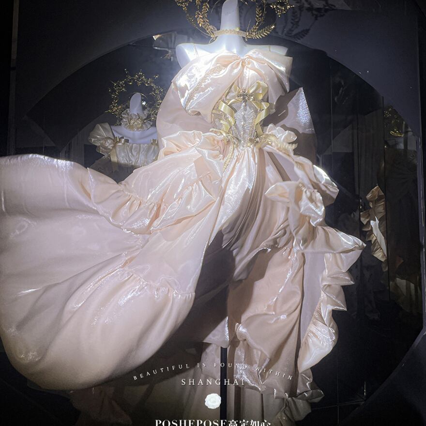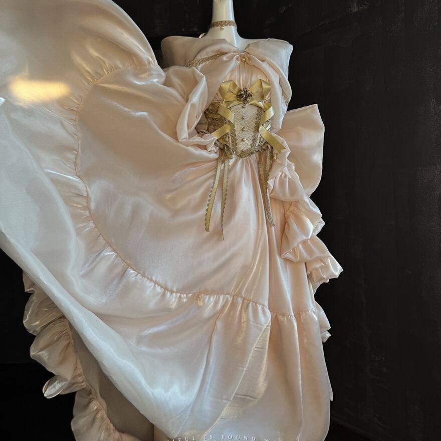ゴージャスなゴールドの光沢感のある生地を基調に、たっぷりのフリルとドレープが贅沢にあしらわれた、壮麗なロング丈のロリータドレスです。