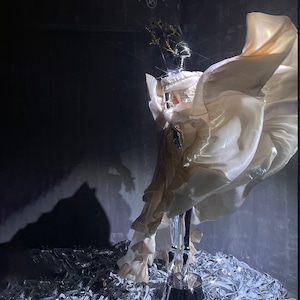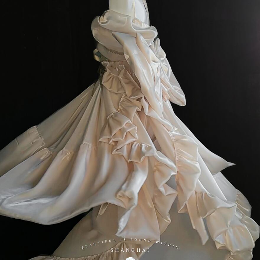 胸元はビスチェのようなデザインで、上品な装飾が施されています。大きく膨らんだパフスリーブと、肩から流れるようなフリルがドラマティックな印象を与えます。