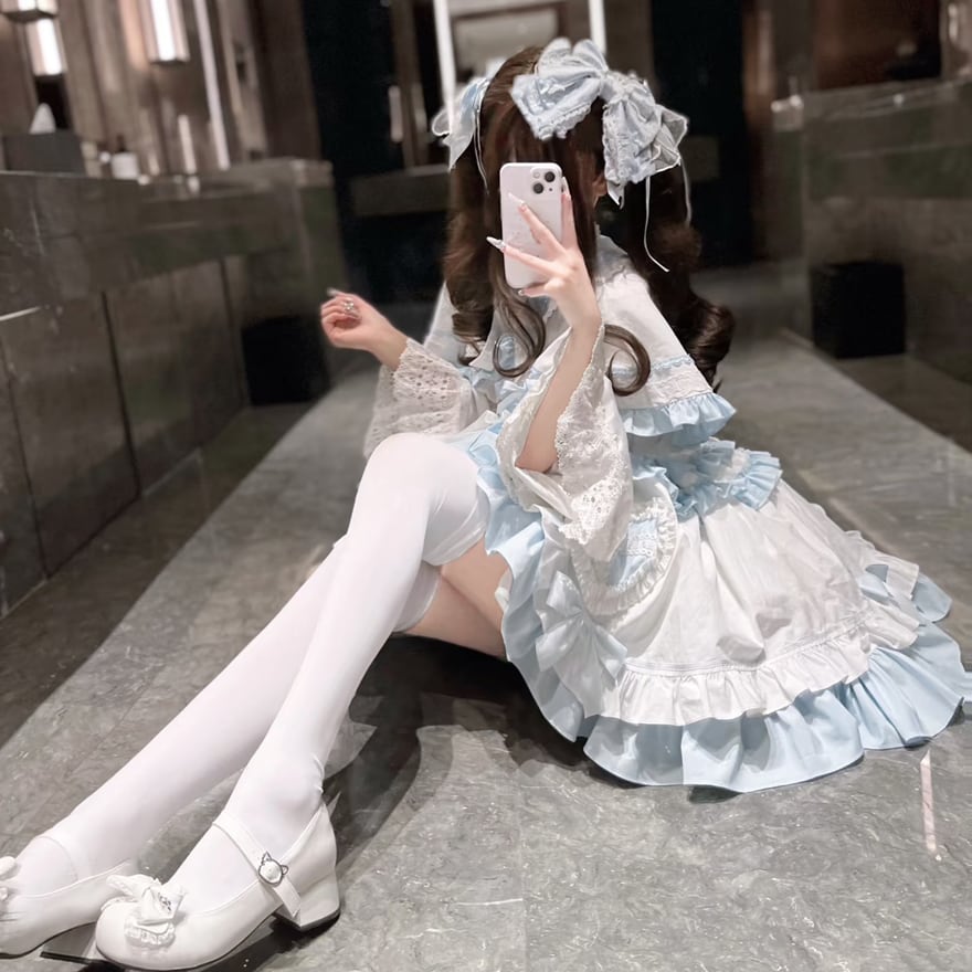 柔らかなオフホワイトの生地に、淡い水色のフリルと繊細なレースがふんだんにあしらわれたジャンパースカートとショールのセットアップです。
